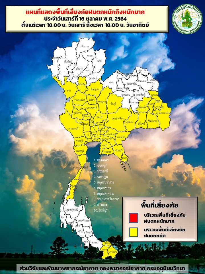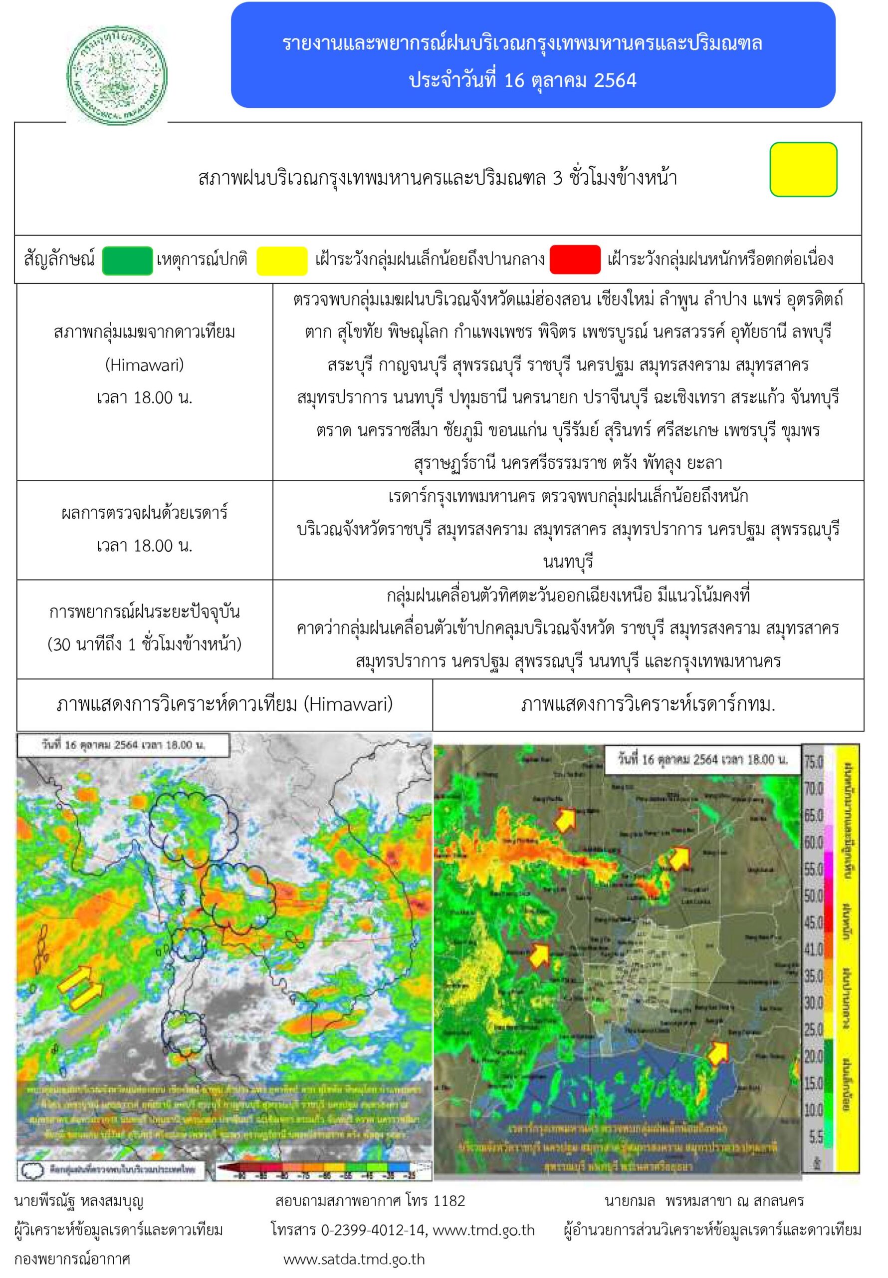 วันที่ 16 ตุลาคม 2564 เมื่อเวลา 18.00 น. กรมอุตุนิยมวิทยา พยากรณ์อากาศ 24 ชั่วโมงข้างหน้าว่า ลักษณะอากาศทั่วไป บริเวณภาคเหนือตอนล่าง ภาคตะวันออกเฉียงเหนือ ภาคกลาง รวมทั้งกรุงเทพมหานครและปริมณฑล ภาคตะวันออก และภาคใต้ มีฝนตกหนักบางพื้นที่