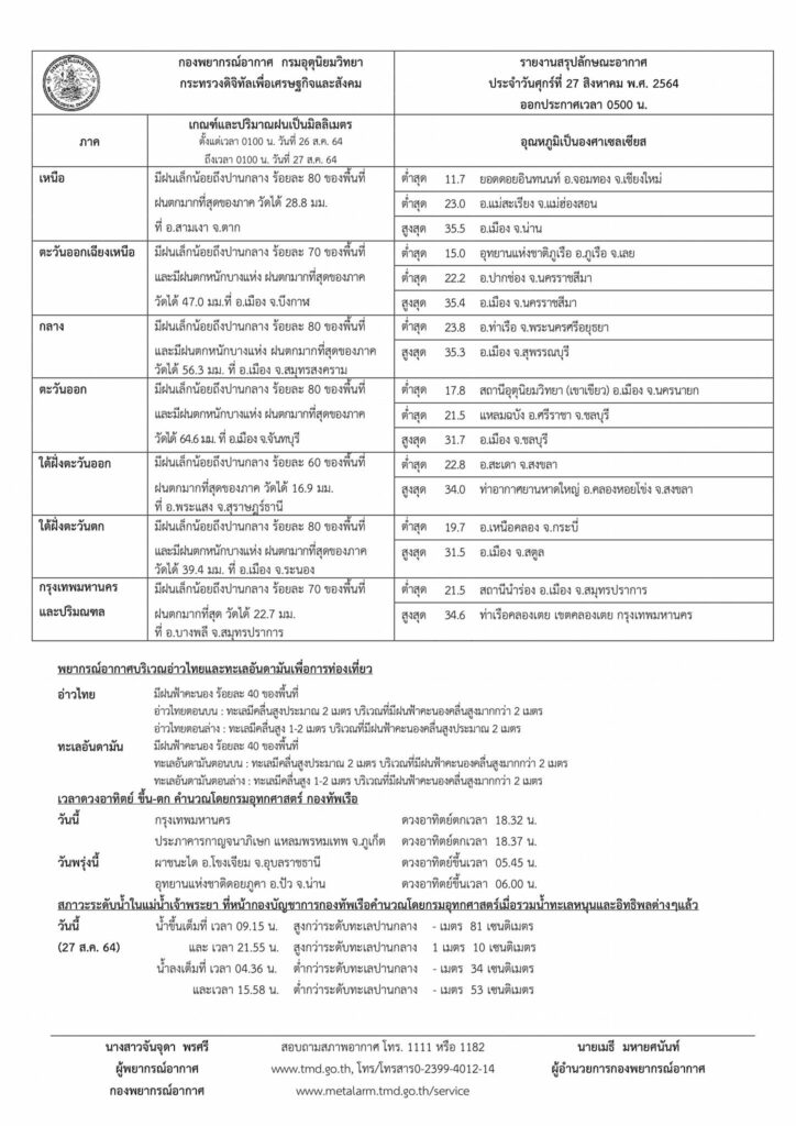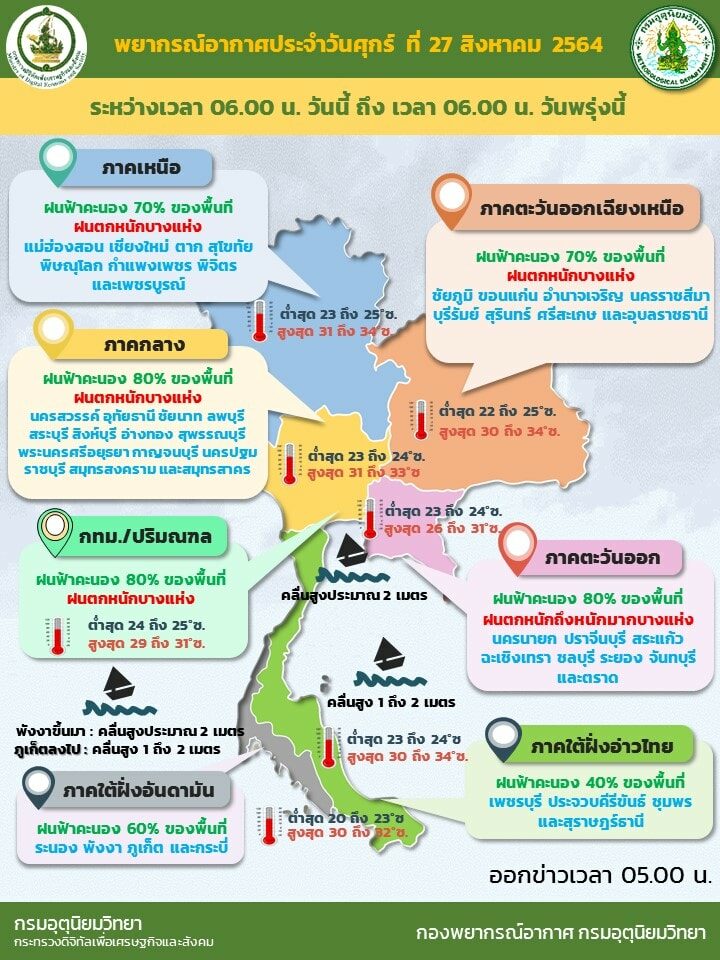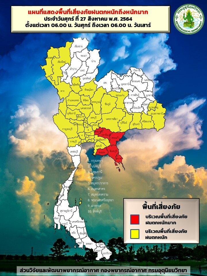 เมื่อวันที่ 27 สิงหาคม กรมอุตุนิยมวิทยา เผยแพร่ กราฟิกพยากรณ์อากาศรายภาคของประเทศไทยพร้อมแผนที่แสดงพื้นที่เสี่ยงภัยฝนตกหนักถึงหนักมากบริเวณประเทศไทย ประจำวันที่ 27 สิงหาคม 2564 เวลา 05.00 น. โดยพบ 6 จังหวัดเสี่ยงภัยฝนตกหนักมาก ได้แก่ นครนายก ปราจีนบุรี สระแก้ว จันทบุรี ระยอง ตราด