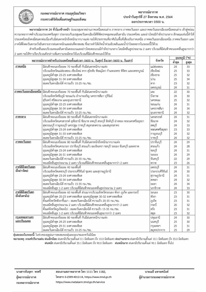 เมื่อวันที่ 27 สิงหาคม กรมอุตุนิยมวิทยา เผยแพร่ กราฟิกพยากรณ์อากาศรายภาคของประเทศไทยพร้อมแผนที่แสดงพื้นที่เสี่ยงภัยฝนตกหนักถึงหนักมากบริเวณประเทศไทย ประจำวันที่ 27 สิงหาคม 2564 เวลา 05.00 น. โดยพบ 6 จังหวัดเสี่ยงภัยฝนตกหนักมาก ได้แก่ นครนายก ปราจีนบุรี สระแก้ว จันทบุรี ระยอง ตราด