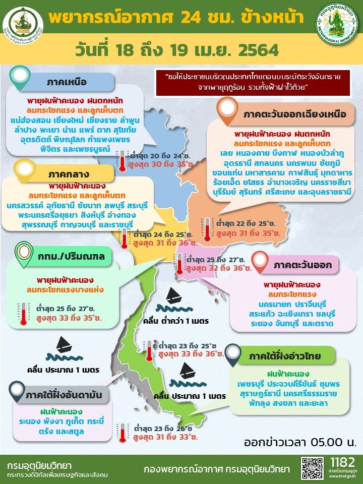 กรมอุตุนิยมวิทยา พยากรณ์อากาศประจำวันที่ 18 เมษายน ระบุว่า ลักษณะอากาศทั่วไปพยากรณ์อากาศ 24 ชั่วโมงข้างหน้า บริเวณภาคเหนือ ภาคตะวันออกเฉียงเหนือ ภาคตะวันออก และภาคกลาง รวมทั้งกรุงเทพมหานครและปริมณฑล มีพายุฤดูร้อนเกิดขึ้น โดยมีลักษณะของพายุฝนฟ้าคะนอง ลมกระโชกแรง และมีลูกเห็บตก รวมถึงอาจมีฟ้าผ่าเกิดขึ้นกับมีฝนตกหนักบางแห่ง ขอให้ประชาชนบริเวณดังกล่าวระมัดระวังอันตรายจากพายุฤดูร้อน รวมทั้งฟ้าผ่าไว้ด้วย
