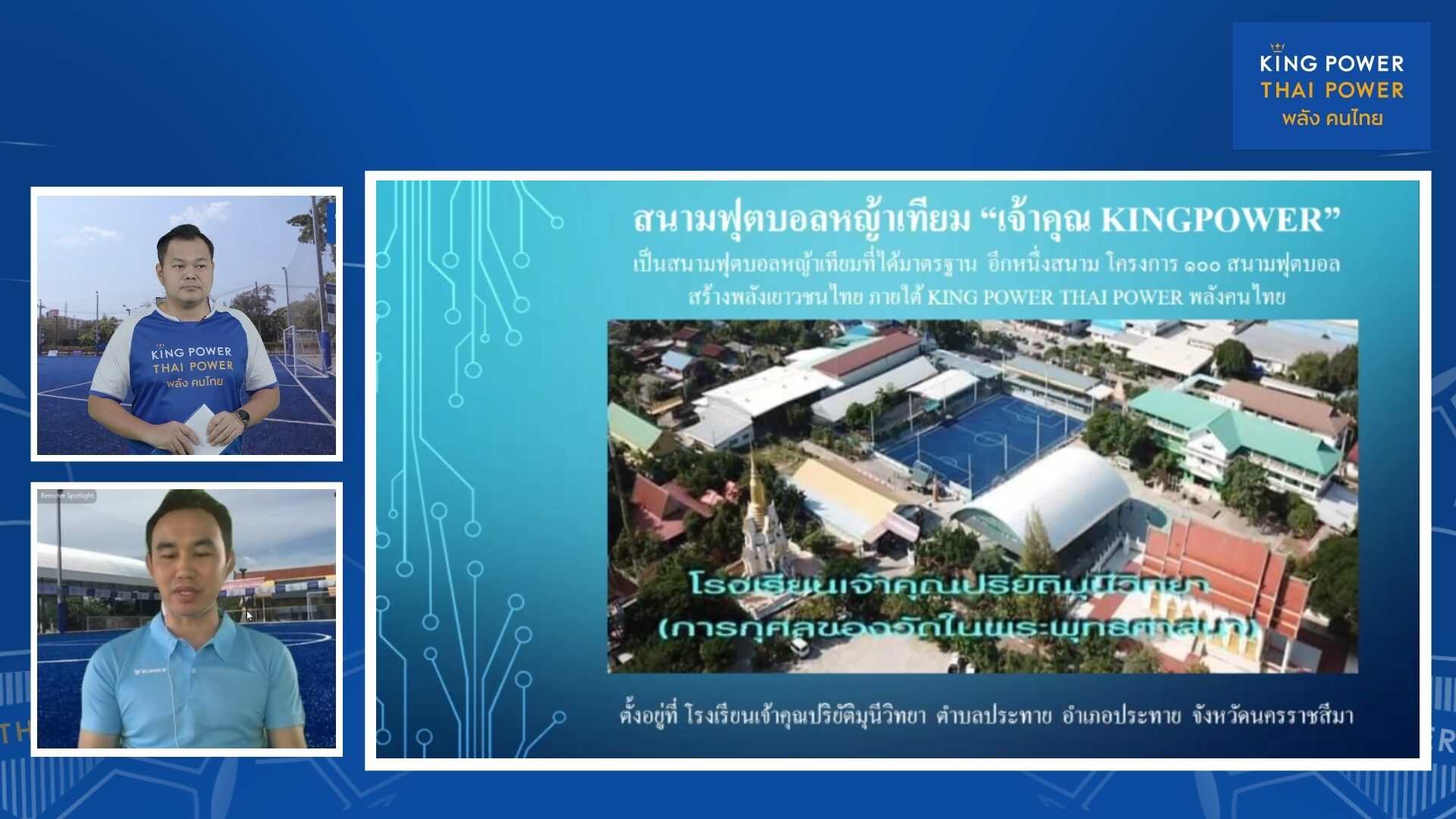 เพราะการมีสนามฟุตบอลที่ได้มาตรฐานสากลจะช่วยส่งเสริม และผลักดันให้เยาวชนไทยได้พัฒนาทักษะ ในการเล่นกีฬาฟุตบอลอย่างเต็มประสิทธิภาพ สอดรับกับวิสัยทัศน์ของกลุ่มบริษัท คิง เพาเวอร์ ที่มุ่งมั่นสนับสนุนศักยภาพด้านกีฬาฟุตบอลของคนไทย ผ่านการสนับสนุนการสร้างสนามฟุตบอลหญ้าเทียมจำนวน 100 สนาม ภายใน 5 ปี ภายใต้โครงการ ‘100 สนามฟุตบอล สร้างพลังเยาวชนไทย’ ในชุมชนทุกภาคทั่วประเทศไทย เพื่อเปิดโอกาสให้เยาวชน และผู้ที่รักในกีฬาฟุตบอลได้เดินตามความฝันสู่นักเตะอาชีพ และเพื่อเป็นพื้นที่ส่วนรวมที่สร้างประโยชน์ให้กับชุมชนโดยรอบ ทั้งนี้ เพื่อให้สนามฟุตบอลหญ้าเทียมคงมาตรฐานสูงสุดและอยู่คู่กับชุมชนได้อย่างยั่งยืนนั้น ต้องคำนึงถึงการดูแล การบริหารจัดการ และการบำรุงรักษาสนามให้ได้มาตรฐานด้วย จึงเป็นที่มาของ ‘โครงการอบรมหลักสูตรบริหารจัดการสนามฟุตบอลหญ้าเทียมอย่างมืออาชีพ’ ปีที่ 4 เพื่อสร้างความรู้ ความเข้าใจเกี่ยวกับวิธีการดูแลสนามฟุตบอล ให้กับโรงเรียน และชุมชน 18 แห่ง ที่ผ่านการคัดเลือกจากทั่วประเทศ โดยปีนี้ จัดงานในรูปแบบออนไลน์ผ่านแอปพลิเคชันซูมเพื่อสอดรับกับมาตรการป้องกันการแพร่ระบาดของโรคโควิด-19 ทั้งนี้ สนามฟุตบอลหญ้าเทียมสีน้ำเงิน จำนวน 18 แห่ง ขนาด 33 x 53 เมตร (7 คนเล่น) ตามมาตรฐานระดับสากล จะก่อสร้างแล้วเสร็จภายในเดือนมีนาคม 2565