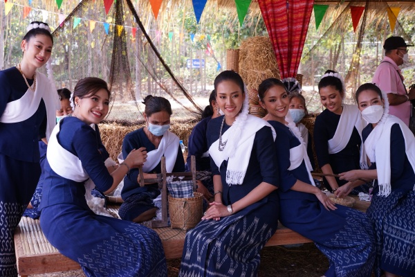 จากนั้น คณะผู้เข้าประกวดนางสาวไทย ปี 65 เดินทางไปที่ศูนย์เรียนรู้ชุมชนภูไท บ้านคำเดือย ต.คำเขื่อนแก้ว อ.ชานุมาน จ.อำนาจเจริญ เพื่อเรียนรู้วิถีวัฒนธรรมความเป็นมาของชาวภูไทบ้านคำเดือย ที่ยังคงความเป็นวิถีชาวบ้านภูไท ที่สืบทอดจากรุ่นสู่รุ่นจากบรรพบุรุษมายาวนาน โดยเรียนรู้การทอผ้าฝ้าย ผ้าย้อมคราม ตั้งแต่เก็บดอกฝ้ายมาทำเป็นเส้นด้าย จนถึง กระบวนการถักทอและแปรรูปเป็นผลิตภัณฑ์ต่างๆที่สวยงาม เช่น เสื้อผ้า ผ้าถุง สไบ กระเป๋า เป็นต้น ซึ่งแต่ละกระบวนการผลิต ชาวบ้านตั้งใจทำด้วยความพิถีพิถัน ทุกขั้นตอนและใช้กระบวนการผลิตจากธรรมชาติ จึงทำให้ผลงานผ้าออกมามีความสวยงามโดดเด่น