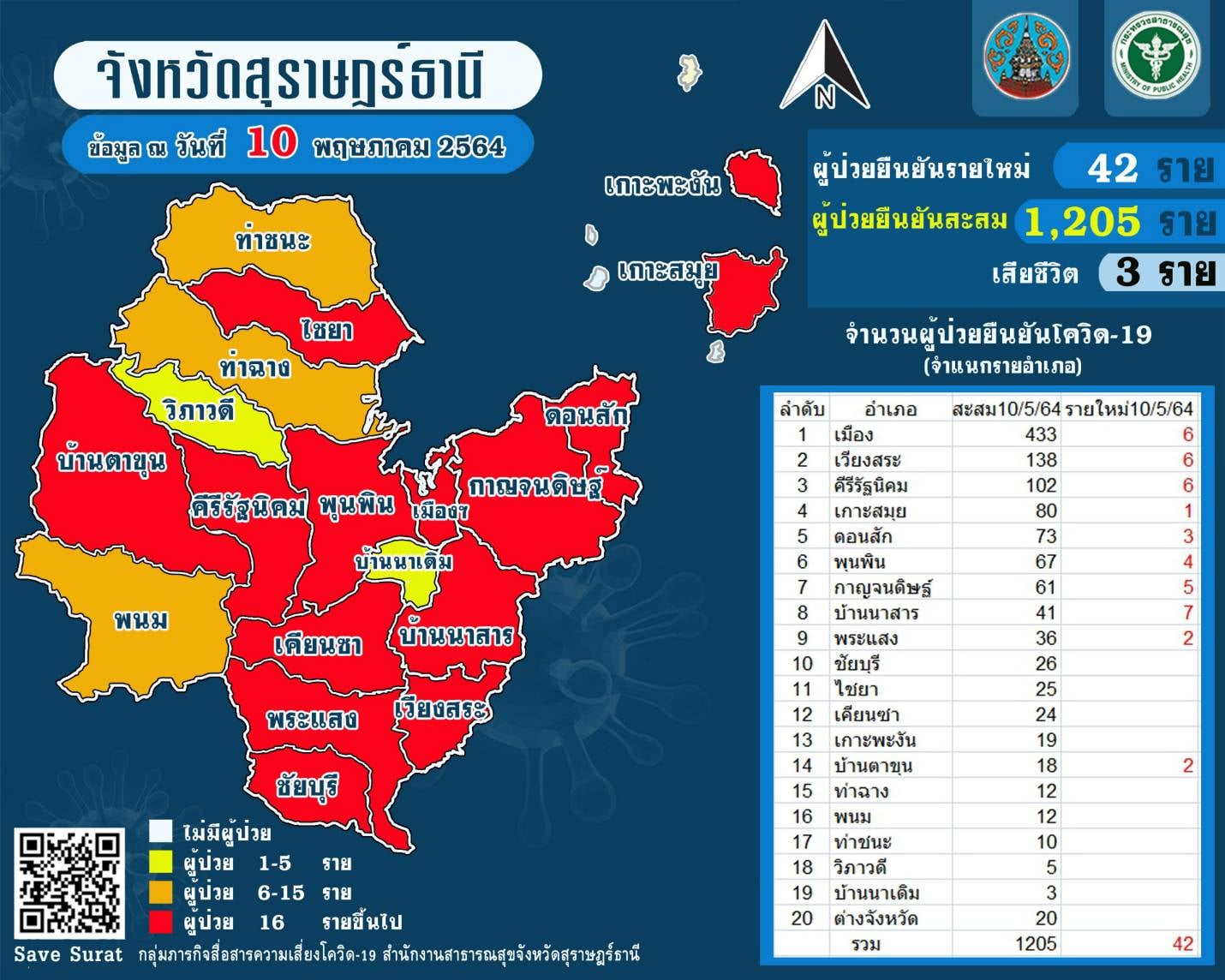 ซึ่งตามข้อมูลจากหมอพร้อมล่าสุด จังหวัดสุราษฎร์ธานีมีผู้จองคิวฉีดวัคซีนผ่านหมอพร้อมเกือบ 1.7 หมื่นคน ขณะที่จำนวนผู้ติดเชื้อสะสมอยู่ที่ 1,205 คน ผู้ป่วยรายใหม่วันนี้ 42 คน