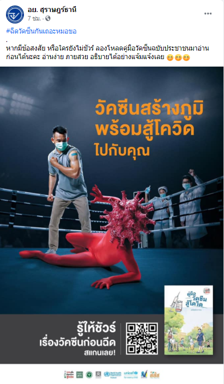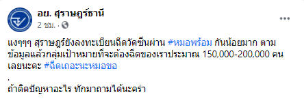 ผู้สื่อข่าวรายงานว่า ที่เพจเฟซบุ๊ก อย.สุราษฎร์ธานี ซึ่งเป็นเพจทางการของกลุ่มงานคุ้มครองผู้บริโภคฯ สำนักงานสาธารณสุขจังหวัดสุราษฎร์ธานี มีการรณรงค์ผ่านโซเชียลอย่างต่อเนื่อง เพื่อให้ประชาชนจองคิวฉีดวัคซีน โดยระบุว่า สุราษฎร์ธานียังลงทะเบียนฉีดวัคซีนผ่านหมอพร้อมกันน้อยมาก ทั้งที่ตามข้อมูลแล้วกลุ่มเป้าหมายที่จะต้องฉีดวัคซีนมีประมาณ 1.5 ถึง 2 แสนคน