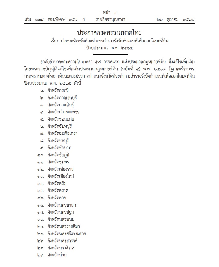 วันที่ 26 ตุลาคม 2564 เว็บไซต์ราชกิจจานุเบกษา เผยแพร่ ประกาศกระทรวงมหาดไทย เรื่อง กำหนดจังหวัดที่จะทำการสำรวจรังวัดทำแผนที่เพื่อออกโฉนดที่ดิน ปีงบประมาณ พ.ศ.2565 ระบุว่า อาศัยอำนาจตามความในมาตรา 58 วรรคแรก แห่งประมวงกฎหมายที่ดิน ซึ่งแก้ไขเพิ่มเติม โดยพระราชบัญญัติแก้ไขเพิ่มเติมประมวลกฎหมายที่ดิน (ฉบับที่ 4) พ.ศ.2528 รัฐมนตรีว่าการกระทรวงมหาดไทย เห็นสมควรประกาศกำหนดจังหวัดที่จะทำการสำรวจรังวัดทำแผนที่เพื่อออกโฉนดที่ดิน ปีงบประมาณ พ.ศ.2565 ดังนี้