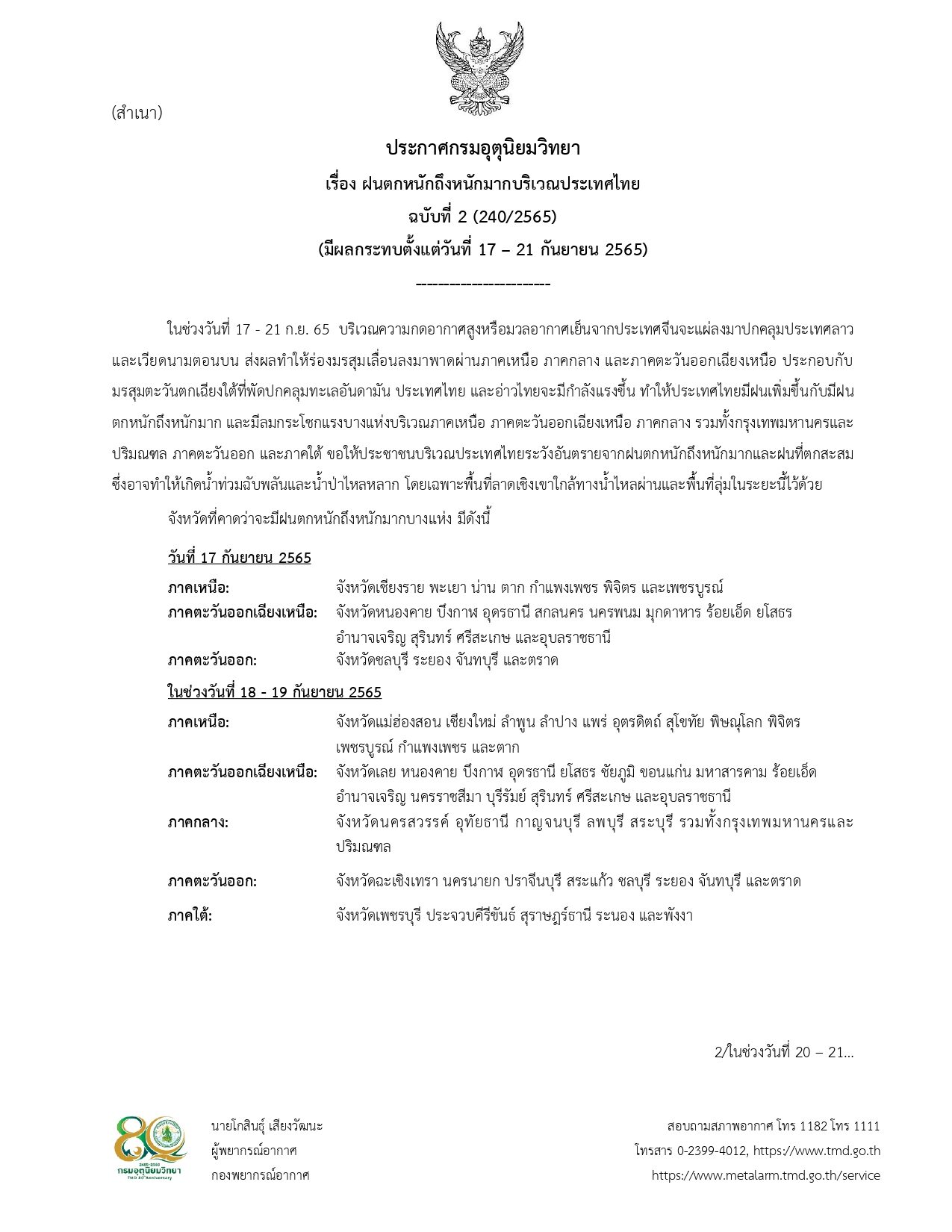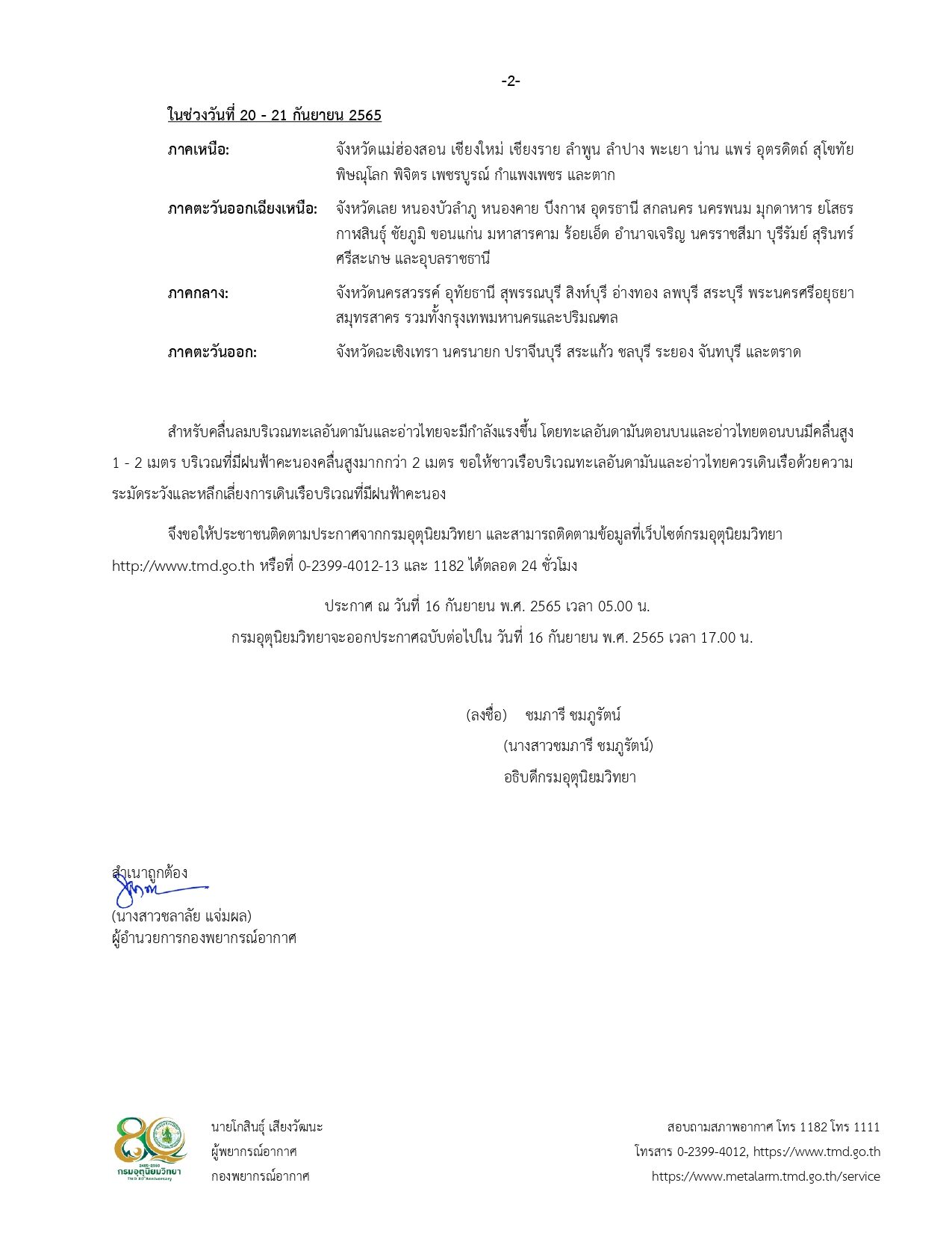 เมื่อวันที่ 16 กันยายน นางสาวชมภารี ชมภูรัตน์ อธิบดีกรมอุตุนิยมวิทยา ออกประกาศประกาศกรมอุตุนิยมวิทยา เรื่อง ฝนตกหนักถึงหนักมากบริเวณประเทศไทย (มีผลกระทบตั้งแต่วันที่ 17-21 กันยายน 2565)
