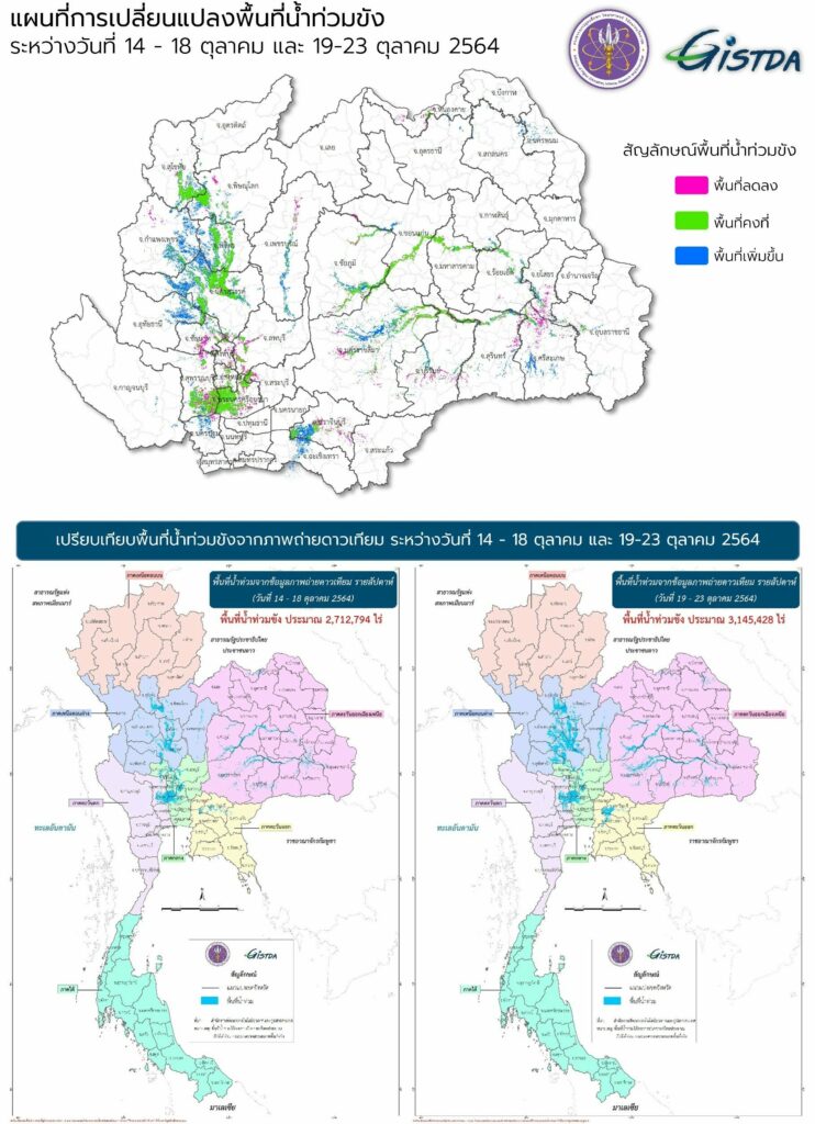 GISTDA ติดตามสถานการณ์น้ำท่วมขังในพื้นที่ประเทศไทยตอนบน และจัดทำแผนที่แสดงการเปลี่ยนแปลงพื้นที่น้ำท่วมขัง โดยใช้ข้อมูลน้ำท่วมขังเปรียบเทียบ 2 ช่วงเวลา ช่วงแรกระหว่างวันที่ 14-18 ตุลาคม และช่วงที่สองระหว่างวันที่ 19-23 ตุลาคม 2564