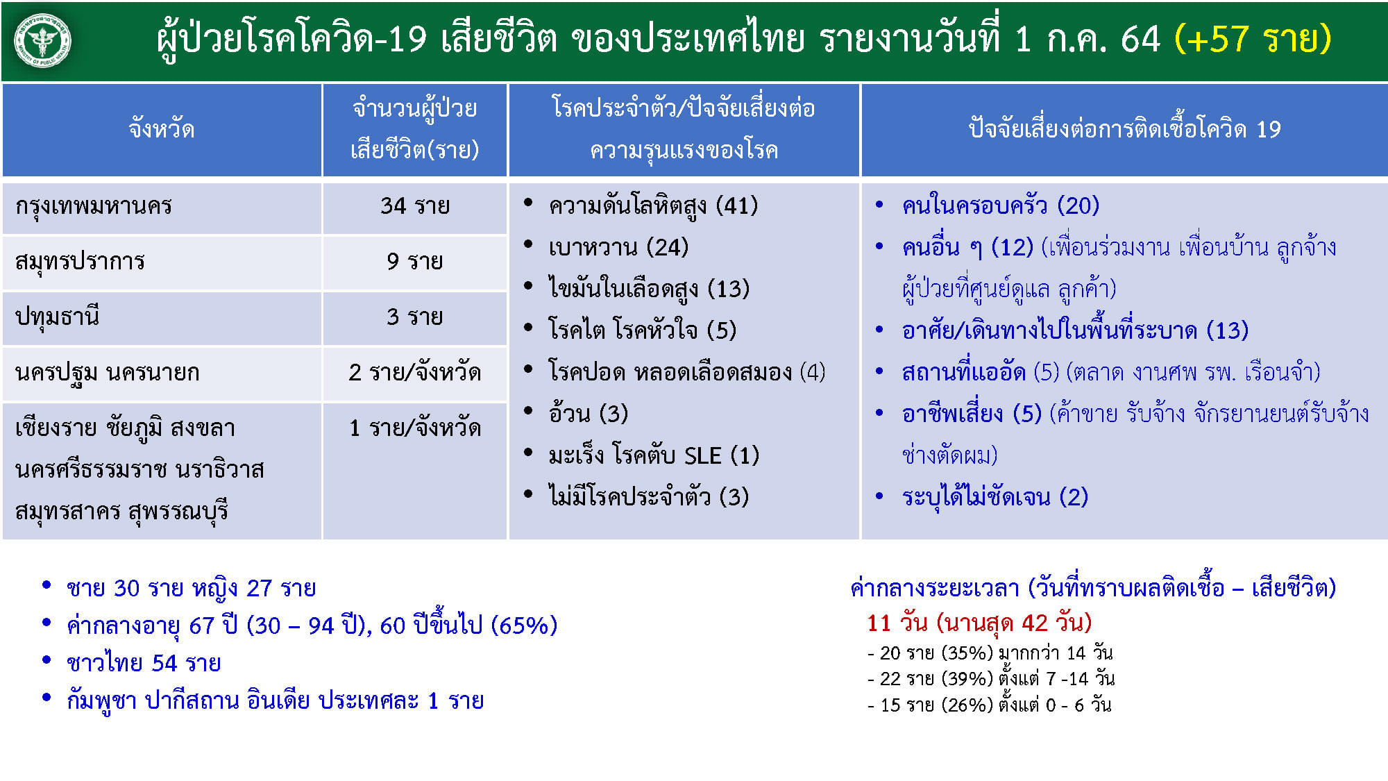 ส่วนผู้เสียชีวิตวันนี้ (1 ก.ค.) จำนวน 57 ราย มาจากกรุงเทพมหานคร (กทม.) สูงถึง 34 ราย สมุทรปราการ 9 ราย ปทุมธานี 3 ราย นครปฐม นครนายก จังหวัดละ 2 ราย และ เชียงราย ชัยภูมิ สงขลา นครศรีธรรมราช นราธิวาส สมุทรสาคร สุพรรณบุรี จังหวัดละ 1 ราย