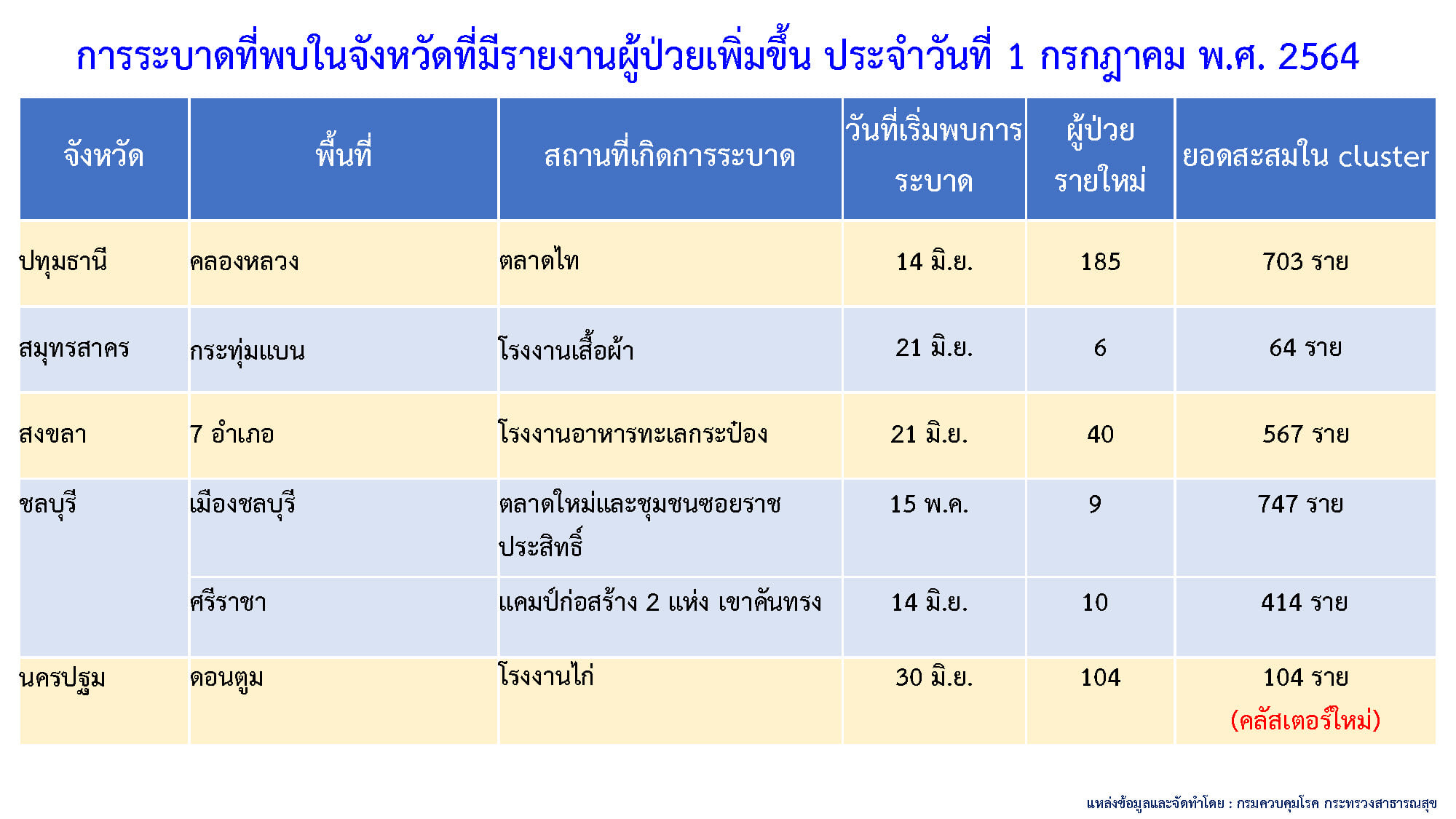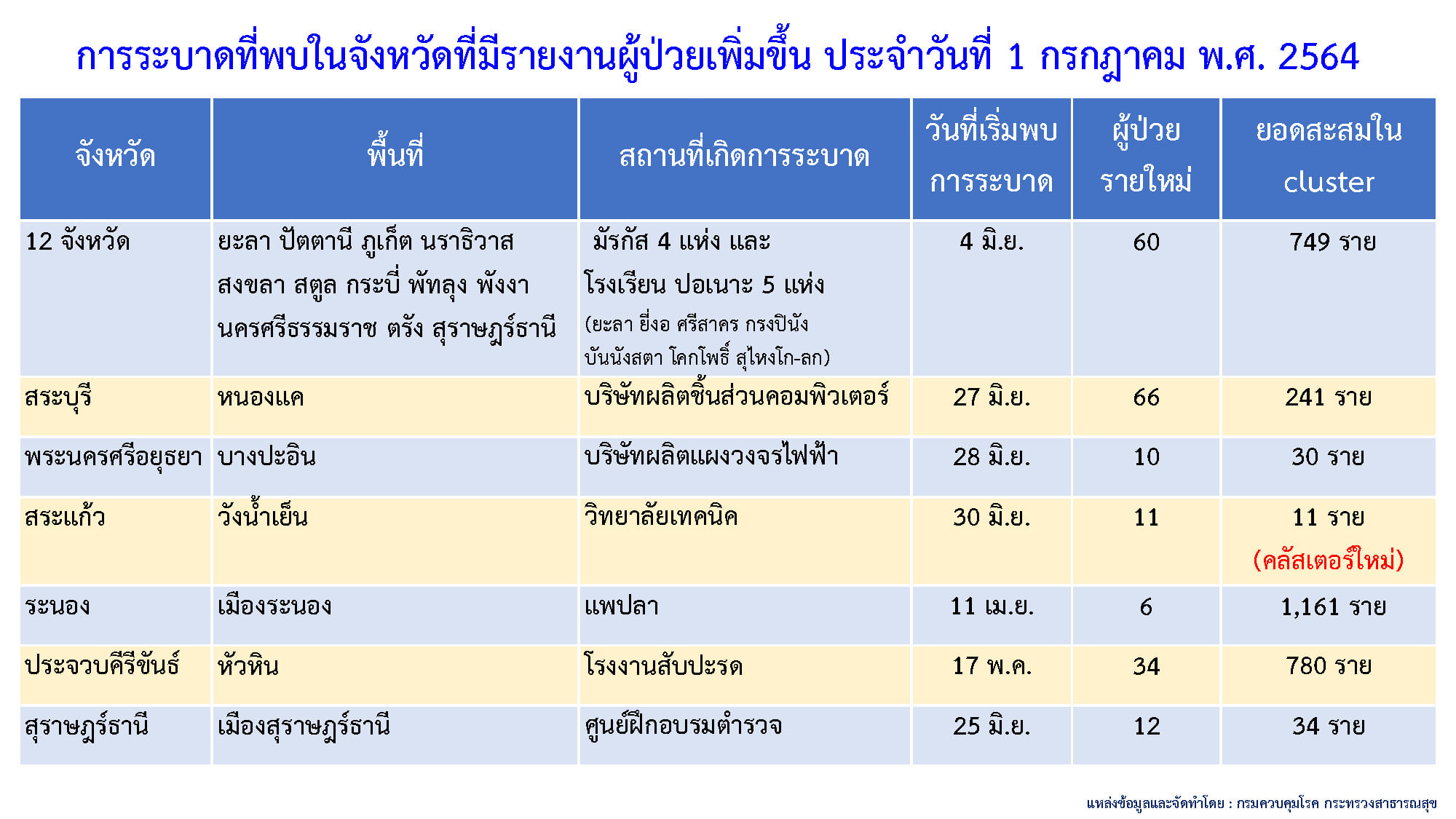 ส่วน “คลัสเตอร์ใหม่” วันนี้ จ.นครปฐม พบคลัสเตอร์ใหม่ที่ อ.ดอนตูม เป็นโรงงานไก่ พบผู้ติดเชื้อรายใหม่ จำนวน 104 ราย และที่ จ.สระแก้ว มีรายงานพบคลัสเตอร์ใหม่ที่ อ.วังน้ำเย็น เป็นวิทยาลัยเทคนิค พบเมื่อ 30 มิ.ย. พบผู้ติดเชื้อ 11 ราย ซึ่งเราเคยมีการรายงานก่อนหน้านี้ที่นักเรียนกลุ่มนี้จบการศึกษา และมีการรายงานการติดเชื้อหลายจังหวัดด้วย เพราะอยู่ในช่วงที่ต้องเดินทางไปฝึกงานตามโรงงานต่าง ๆ