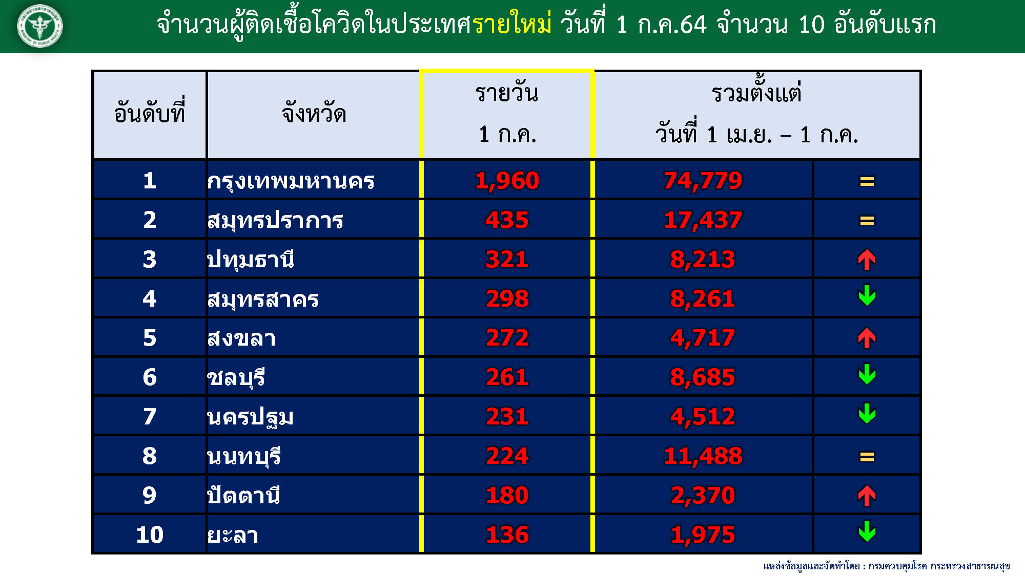 ขณะที่ 10 จังหวัด ที่มีผู้ติดเชื้อสูงสุดวันนี้ (1 ก.ค.) กทม.พบผู้ติดเชื้อมากที่สุดถึง 1,960 ราย รวมสะสม 74,779 ราย สมุทรปราการ 435 ราย ปทุมธานี 321 ราย สมุทรสาคร 298 ราย สงขลา 272 ราย ชลบุรี 261 ราย นครปฐม 231 ราย นนทบุรี 224 ราย ปัตตานี 180 ราย และยะลา 136 ราย (ตามตาราง)