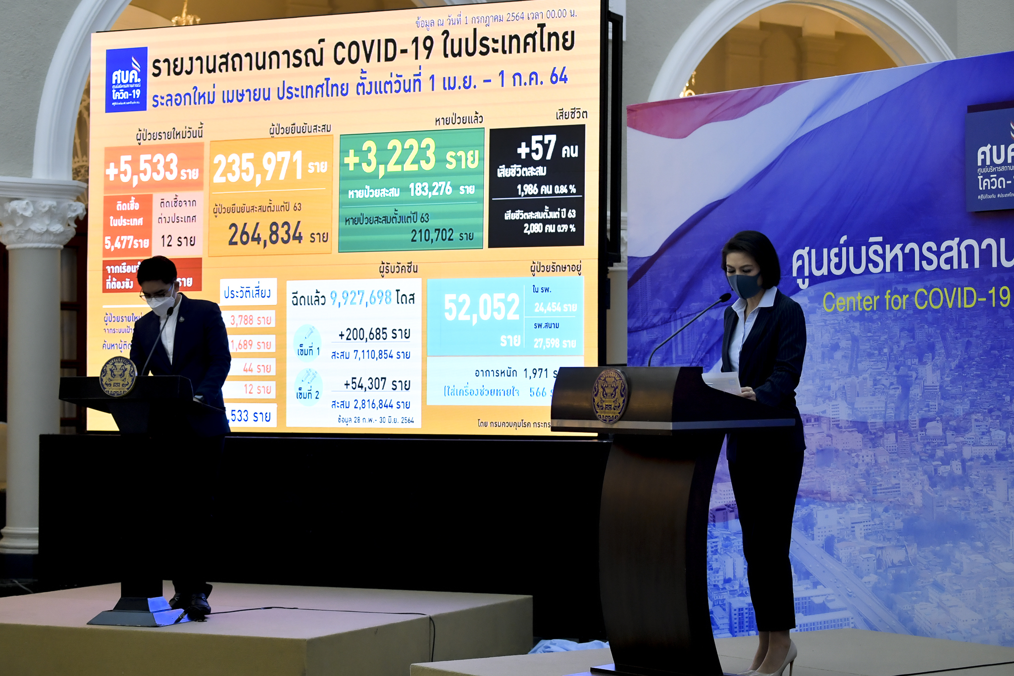 วันที่ 1 กรกฎาคม 2564 แพทย์หญิงอภิสมัย ศรีรังสรรค์ ผู้ช่วยโฆษกศูนย์บริหารสถานการณ์โควิด-19 (ศบค.) รายงานสถานการณ์ผู้ติดเชื้อโควิดประจำวันว่า วันนี้สถานการณ์การติดเชื้อในประเทศ ข้อมูลตั้งแต่วันที่ 1 เมษายน 2564 พบผู้ป่วยรายใหม่ 5,533 ราย ผู้ป่วยยืนยันสะสม 235,971 ราย หายป่วยแล้ว 183,276 ราย เสียชีวิตสะสม 1,986 ราย