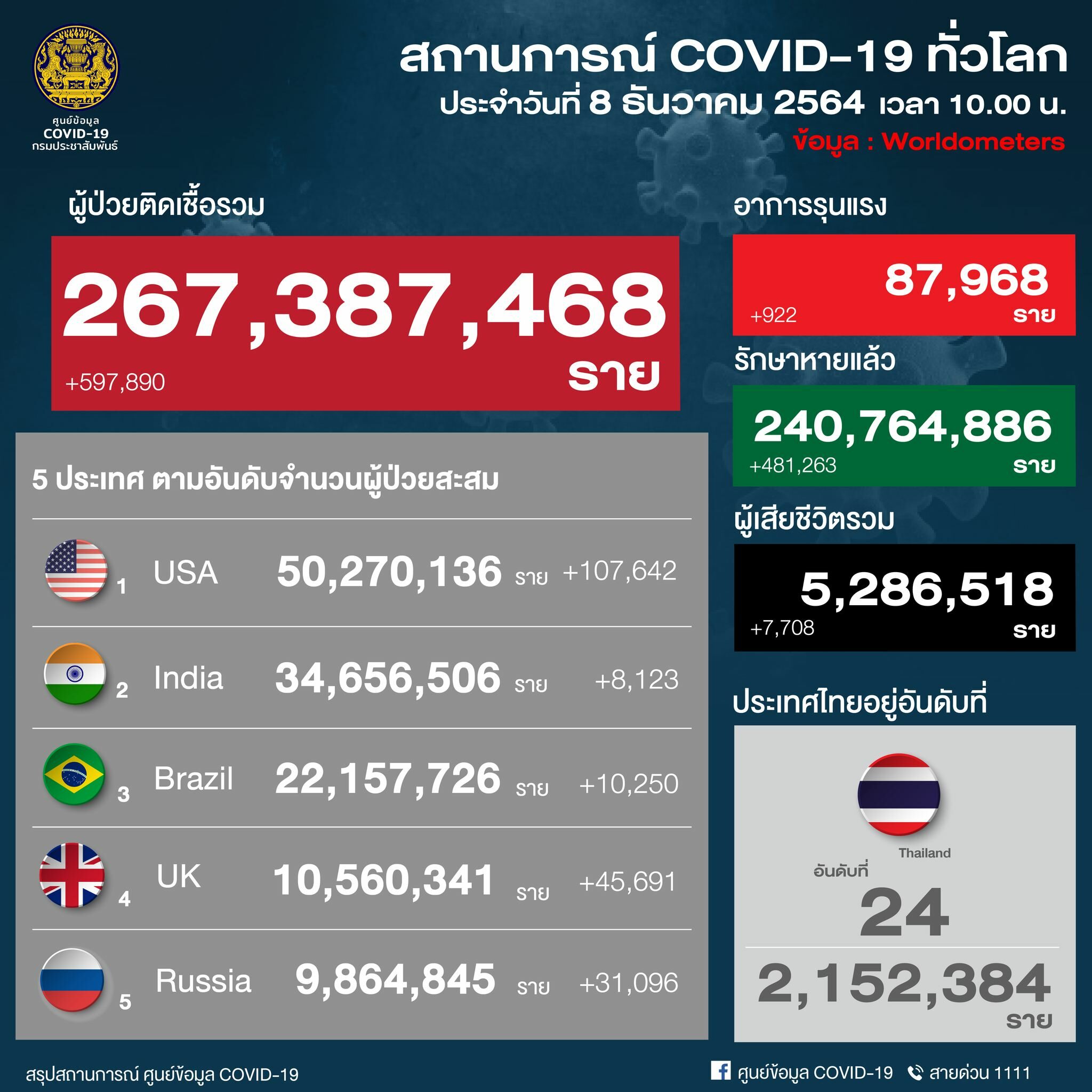เมื่อวันที่ 8 ธันวาคม ศูนย์บริหารสถานการณ์การแพร่ระบาดของโรคติดเชื้อไวรัสโคโรนา 2019 (โควิด-19) หรือ ศบค. รายงานสถานการณ์การติดเชื้อโควิด-19 ทั่วโลก มียอดผู้ติดเชื้อใหม่เพิ่ม 597,890 ราย มียอดรวม 267,387,468 ราย อาการรุนแรง 87,968 ราย รักษาหายแล้ว 240,764,886 ราย เสียชีวิตรวม 5,286,518 ราย