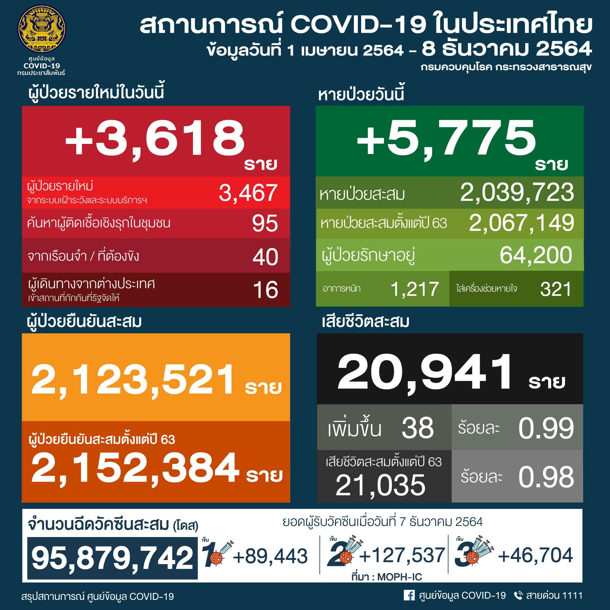 สำหรับสถานการณ์ในประเทศ มีติดเชื้อเพิ่ม 3,618 ราย เป็นผู้ป่วยรายใหม่ 3,467 ราย ค้นหาผู้ติดเชื้อเชิงรุกในชุมชน 95 ราย จากเรือนจำ/ที่ต้องขัง 40 ราย จากผู้เดินทางจากต่างประเทศ 16 ราย