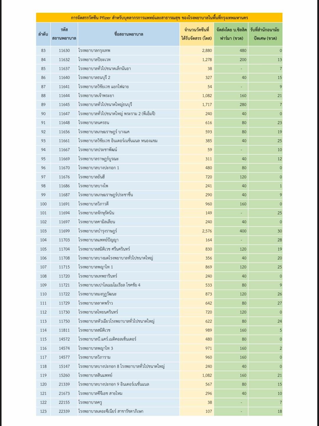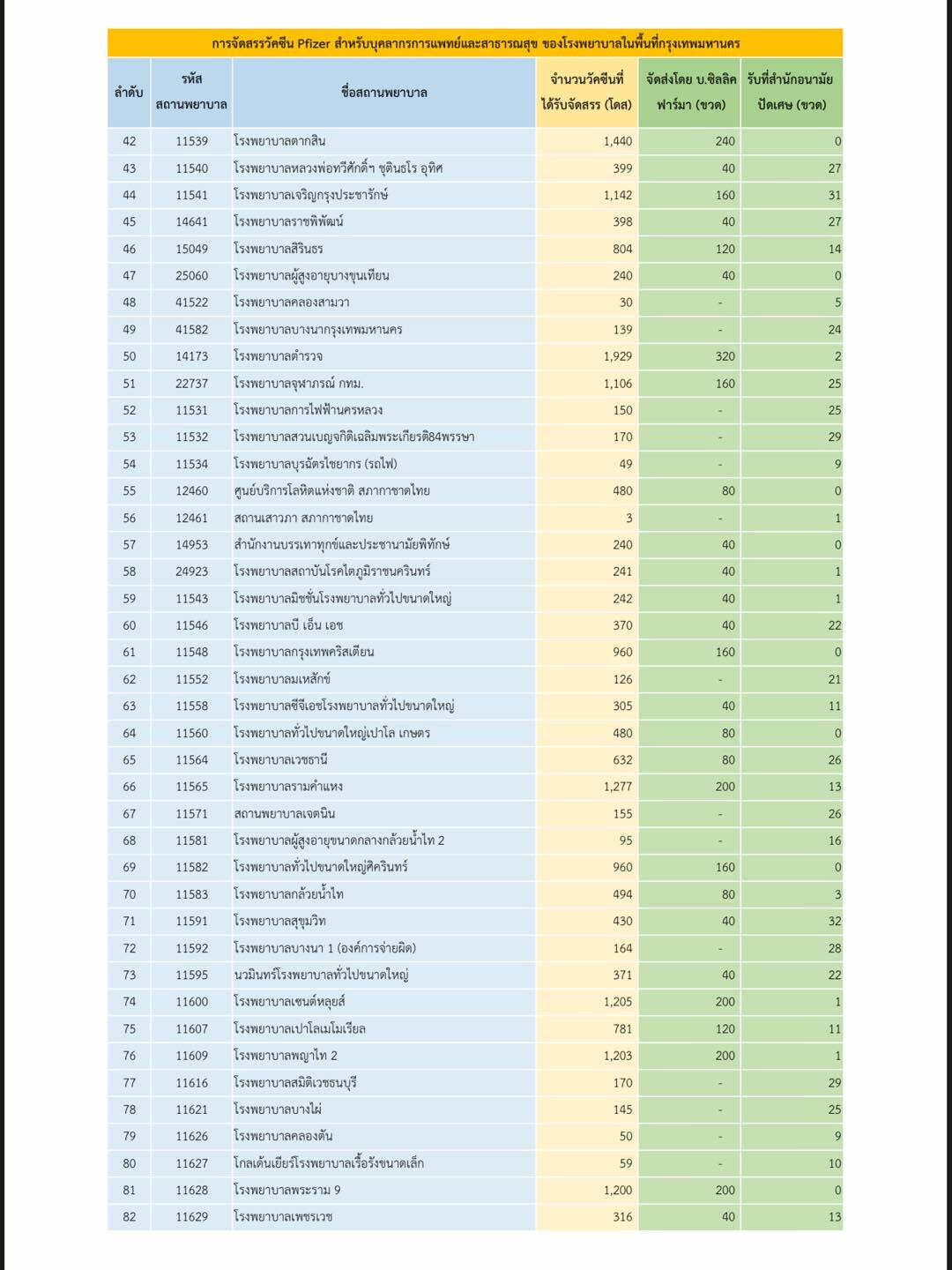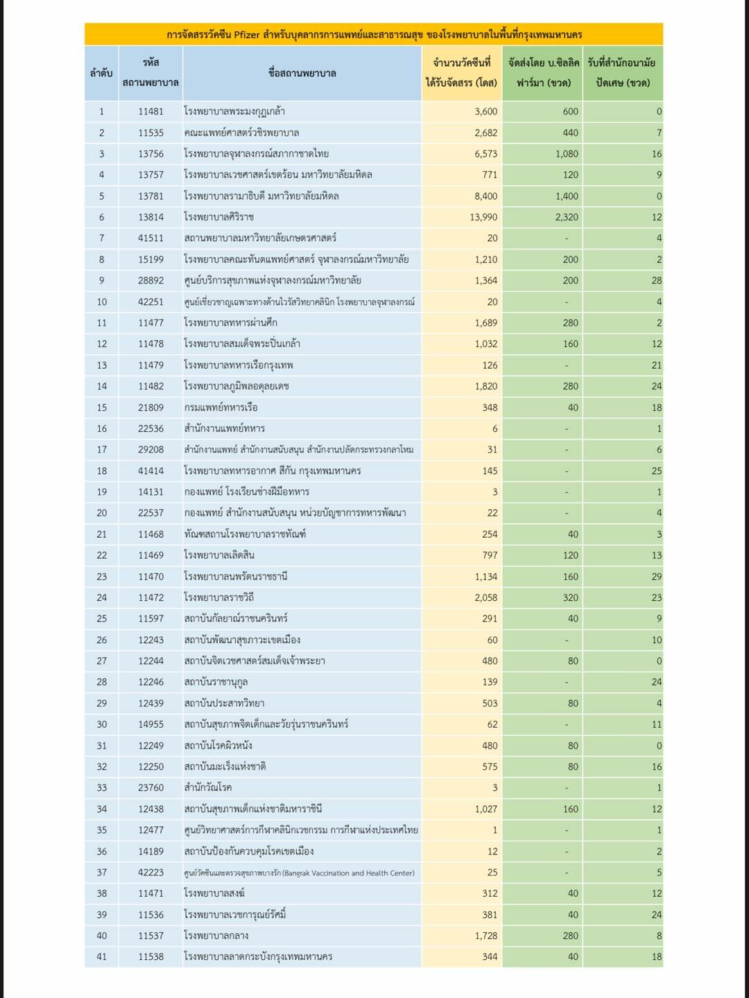 ผู้สื่อข่าวรายงานว่า จากเอกสารการนำส่งวัคซีนไฟเซอร์มีการจัดสรรวัคซีนให้แต่ละจังหวัด ดังนี้