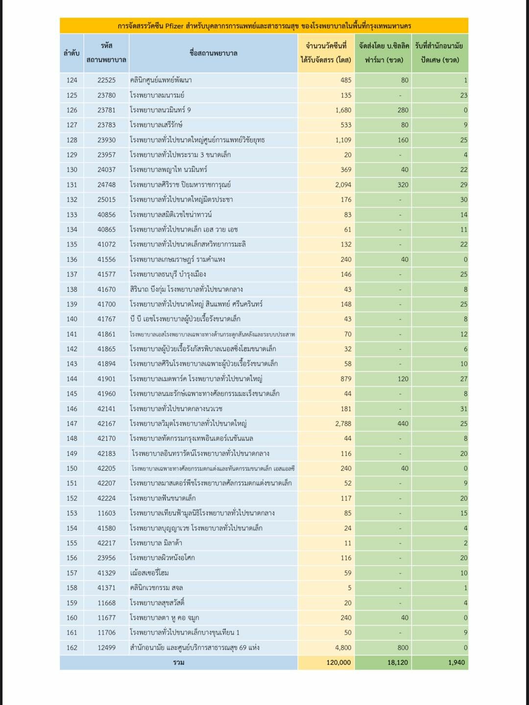 สำหรับ กรุงเทพมหานคร จัดส่งไปที่สถานพยาบาล รพ.ทั้งภาครัฐและเอกชน รวม 162 แห่งทั่วกรุงเทพฯ รวมทั้งหมด 120,000 โดส