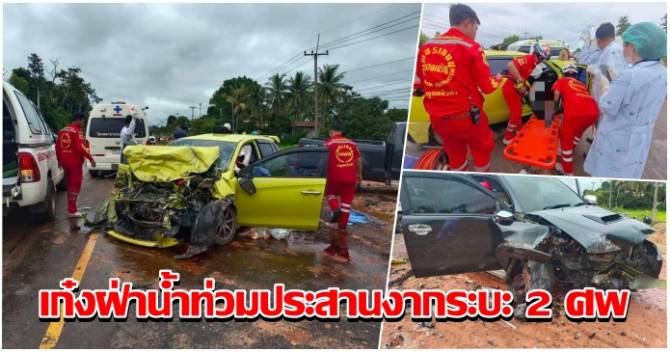 สาวขับเก๋งฝ่าน้ำท่วมเสียหลักข้ามเลนประสานงากระบะ ตาย 2 เจ็บ 4 ราย