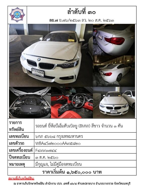 5.รถยนต์ ยี่ห้อ BMW สีขาว จำนวน 1 คัน ราคาเริ่มต้น 1,650,000 บาท