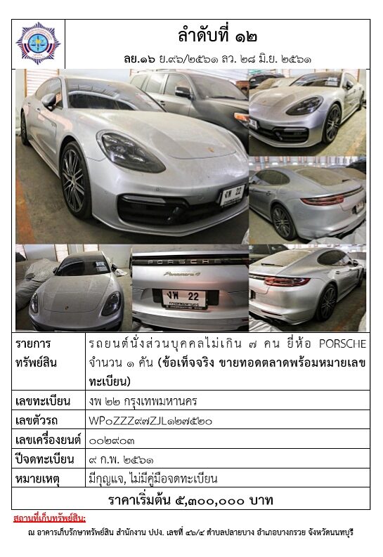 1.รถยนต์นั่งส่วนบุคคลไม่เกิน 7 คน ยี่ห้อ PORSCHE จำนวน 1 คัน ราคาเริ่มต้น 5,300,000 บาท