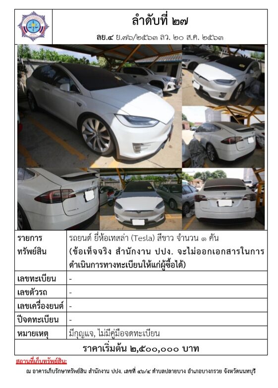 2.รถยนต์ยี่ห้อ เทสล่า (Tesla) สีขาว จำนวน 1 คัน ราคาเริ่มต้น 2,500,000 บาท
