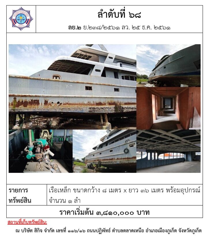 - ทรัพย์สินลำดับที่ 68 ที่บริษัท สิกิจ จำกัด เลขที่ 116/16 ถนนปฏิพัทธ์ ต.ตลาดเหนือ อ.เมือง จ.ภูเก็ต