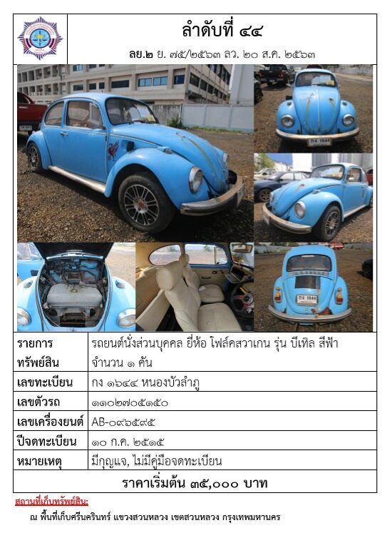 4.รถยนต์นั่งส่วนบุคคล ยี่ห้อ โฟล์คสวาเกน รุ่น บีเทิล สีฟ้า จำนวน 1 คัน ราคาเริ่มต้น 35,000 บาท