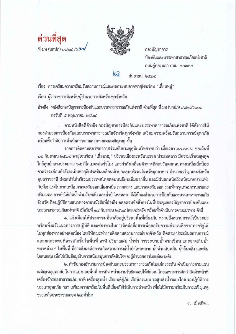 เมื่อวันที่ 24 ก.ย. 2564 พล.อ.อนุพงษ์ เผ่าจินดา รมว.มหาดไทย ในฐานะผู้บัญชาการป้องกันและบรรเทาสาธารณภัยแห่งชาติ (บกปภ.ช.) เปิดเผยว่า จากการติดตามสภาพอากาศร่วมกับกรมอุตุนิยมวิทยา พบว่าเมื่อเวลา 10.00 น. พายุโซนร้อน “เตี้ยนหมู่” บริเวณเมืองสะหวันนะเขต ประเทศลาว มีความเร็วลมสูงสุดใกล้ศูนย์กลางประมาณ 65 กิโลเมตรต่อชั่วโมง และกำลังเคลื่อนตัวทางทิศตะวันตกค่อนทางเหนือเล็กน้อย คาดว่าจะอ่อนกำลังลงเป็นพายุดีเปรสชั่นเคลื่อนเข้าปกคลุมบริเวณจ.มุกดาหาร อำนาจเจริญ และอุบลราชธานี