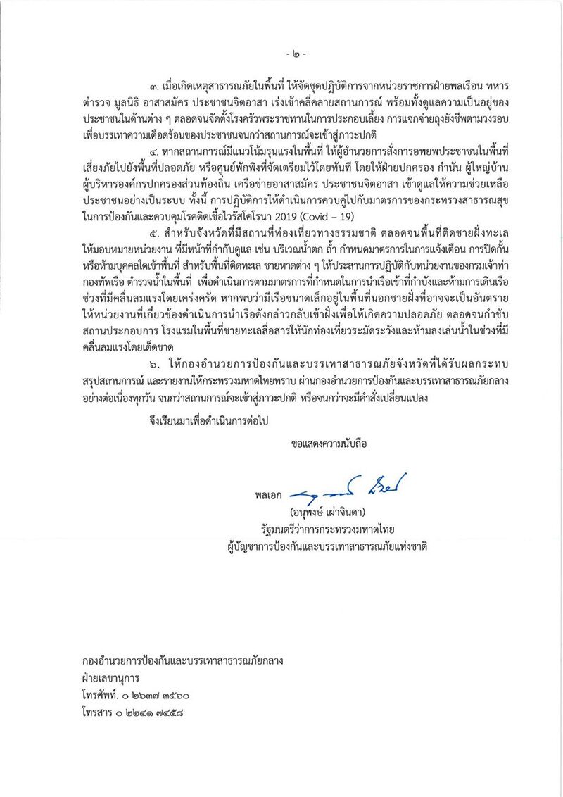 5.สำหรับจังหวัดที่มีสถานที่ท่องเที่ยวทางธรรมชาติ ตลอดจนพื้นที่ติดชายฝั่งทะเล ให้มอบหมายหน่วยงานที่มีหน้าที่กำกับดูแลสถานที่ดังกล่าว กำหนดมาตรการในการแจ้งเตือน การปิดกั้นหรือห้ามบุคคลใดเข้าพื้นที่ สำหรับพื้นที่ติดทะเล ชายหาดต่างๆ ให้ประสานการปฏิบัติกับหน่วยงานที่เกี่ยวข้องในพื้นที่ ดำเนินการตามมาตรการที่กำหนดในการนำเรือเข้าที่กำบังและห้ามการเดินเรือช่วงที่มีคลื่นลมแรงโดยเคร่งครัด หากพบว่ามีเรือขนาดเล็กอยู่ในพื้นที่นอกชายฝั่งที่อาจจะเป็นอันตราย ให้นำเรือดังกล่าวกลับเข้าฝั่งเพื่อความปลอดภัย