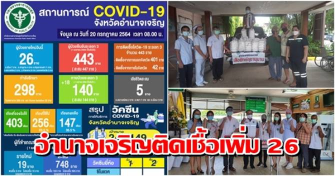 โดยมี รายละเอียด ดังนี้ ผู้ป่วยรายใหม่วันนี้ 26 ราย อ.เมืองอำนาจเจริญ 7 ราย อ.ชานุมาน 4 ราย อ.ปทุมราชวงศา 1 ราย อ.เสนางคนิคม 3 ราย อ.หัวตะพาน 8 ราย นอกเขตจังหวัด 3 ราย ผู้ป่วยยันยืน ระลอก 3 ( 1 เมษายน 2564 เป็นต้นไป) 443 ราย (สะสม 447 ราย) กำลังรักษา 298 ราย โรงพยาบาล 266 ราย และ Home Isolution) 32 ราย หายป่วยระลอก 3 ( 1 เมษายน 2564 เป็นต้นไป) 140 ราย(สะสม 144 ราย) เสียชีวิตสะสม 5 ราย อ.เสนางคนิคม 2 ราย อ.พนา 1 ราย อ.เมืองอำนาจเจริญ 2 ราย ผู้ที่เข้าเกณฑ์สงสัย(PUI) ระลอก 3( 1 เมษายน 2564 เป็นต้นไป) รายใหม่ 19 ราย พบเชื้อ 3 ราย ไม่พบเชื้อ 16 ราย รอผลตรวจ 0 ราย สะสม 748 ราย พบเชื้อ 183 ราย ไม่พบเชื้อ 565 ราย รอผลตรวจ 0 ราย ผู้ที่เดินทางกลับมาจากจังหวัดพื้นที่ควบคุมสูงสุดและเข้มงวด พื้นที่ควบคุมสูงสุด พื้นที่ควบคุม ตั้งแต่วันที่ 1 เมษายน – 18 กรกฎาคม 2564 รายใหม่ 312 ราย สะสม 26,077 ราย
