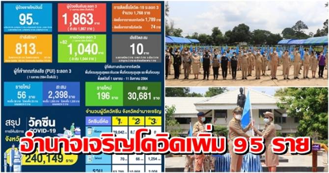 เมื่อเวลา 12.00 น. วันที่ 12 ส.ค. 64 ผู้สื่อข่าวรายงานสถานการณ์โควิด – 19 จังหวัดอำนาจเจริญ ข้อมูล จากสำนักงานสาธารณสุขจังหวัดอำนาจเจริญว่า วันนี้( 12 ส.ค.64) มีผู้ป่วยยืนยันรายใหม่เพิ่ม 95 ราย เป็นผู้ติดเชื้อเดินทางมาจากพื้นที่เสี่ยง และเข้ารับการรักษาที่โรงพยาบาลทันที ที่มาถึง จำนวน 95 ราย มีภูมิลำเนากระจายไป 7 อำเภอ ประกอบด้วย อ.เมืองอำนาจเจริญ จำนวน 24 ราย อ.ชานุมาน จำนวน 11 ราย อ.ปทุมราชวงศา จำนวน 18 ราย อ.พนา จำนวน 19 ราย อ.เสนางคนิคม จำนวน 5 ราย อ.หัวตะพาน จำนวน 12 ราย และ อ.ลืออำนาจ จำนวน 5 ราย เป็นผู้ติดเชื้อภายในจังหวัด จำนวน 1 ราย ที่หมู่ที่ 12 ต.สร้างถ่อน้อย อ.หัวตะพาน รวมมีผู้ป่วยยืนยัน สะสม ระลอก 3 จำนวน 1,863 ราย แยกเป็นติดเชื้อภานนอกจังหวัด จำนวน 1,789 ราย ติดเชื้อภายในจังหวัด จำนวน 74 ราย กำลังรักษา จำนวน 813 ราย ที่โรงพยาบาล จำนวน 215 ราย โรงพยาบาลสนาม จำนวน 197 ราย Home Isolation จำนวน 173 ราย Community Isolation จำนวน 192 ราย หายป่วยเพิ่ม 82 ราย รวมหายป่วย ระลอก 3 จำนวน 1,040 ราย ไม่มีผู้เสียชีวิตเพิ่ม มีผู้เสียชีวิตสะสม จำนวน 10 ราย คือ อ.เสนางคนิคม จำนวน 2 ราย อ.พนา จำนวน 2 ราย อ.เมืองอำนาจเจริญ จำนวน 3 ราย อ.ชานุมาน จำนวน 2 ราย และ อ.หัวตะพาน จำนวน 1 ราย