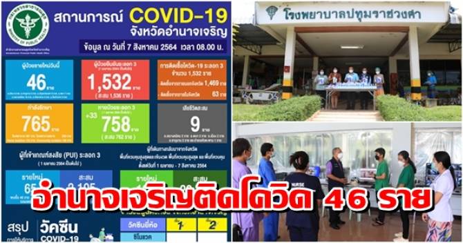 โดยมีรายละเอียดดังนี้ ผู้ป่วยรายใหม่วันนี้ 46 ราย อ.เมืองอำนาจเจริญ 6 ราย อ.ชานุมาน 5 ราย อ.ปทุมราวงศา 5 ราย อ.พนา 7 ราย อ.เสนางคนิคม 16 ราย อ.หัวตะพาน 4 ราย อ.ลืออำนาจ 3 ราย ผู้ป่วยยืนยันระลอก 3( 1 เมษายน เป็นค้นไป 1,532 ราย กำลังรักษา 765 ราย หายป่วยระลอก 3 ( 1 เมษายน 2564 เป็นต้นไป สะสม 1,536 ราย กำลังรักษา 765 ราย หายป่วยระลอก 3 ( 1เมษายน 2564 เป็นต้นไป ) 758 ราย เสียชีวิตสะสม 9 ราย ผู้ที่เข้าเกณฑ์สงสัย (PUI) ระลอก 3( 1 เมษายน 2564 เป็นต้นไป) รายใหม่ 65 ราย พบเชื้อ 46 ราย ไม่พบเชื้อ 19 ราย รอผลตรวจ 0 ราย สะสม 2,105 บาท สะสม 2105 ราย พบเชื้อ 887 ราย ไม่พบเชื้อ 1,218 ราย รอผลตรวจ 0 ราย ผู้ที่เดินทางกลับมาจากจังหวัดพื้นที่ควบคุมสูงสุดและเข้มงวด พื้นที่ควบคุมสูงสุด และพื้นที่ควบคุม ตั้งแต่วันที่ 1 เมษายน – 7 สิงหาคม 2564 รายใหม่ 103 ราย สะสม 29,715 ราย