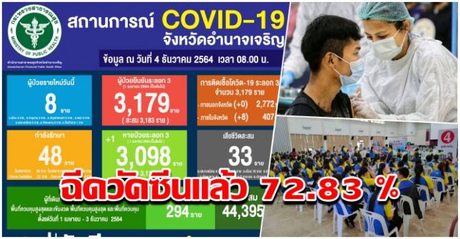 อำนาจเจริญติดโควิด 8 ราย ฉีดวัคซีนแล้ว 72.83 %