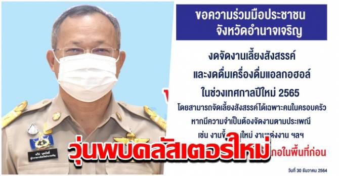 และ ประกาศจังหวัดอำนาจเจริญ ขอความร่วมมือประชาชนจังหวัดอำนาจเจริญ งดจัดงานเลี้ยงสังสรรค์ และงดดื่มเครื่องดื่มแองกอฮอล์ ในช่วงเทศกาลปีใหม่ 2565 โดยสามารถจัดเลี้ยงสังสรรค์ได้เฉพาะคนในครอบครัว หากมีความจำเป็นต้องจัดงาน ตามประเพณี เช่น งานขึ้นบ้านใหม่ งานแต่งงาน ฯลฯ ให้ขออนุญาตจากนายอำเภอในพื้นที่ก่อน