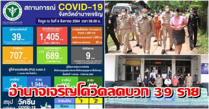 เมื่อเวลา 13.00 น.วันที่ 6 ส.ค.64 ผู้สื่อข่าวรายงาน สถานการณ์โควิด – 19 จังหวัดอำนาจเจริญ ข้อมูล จากสำนักงานสาธารณสุขจังหวัดอำนาจเจริญว่า ผู้ป่วยยืนยันรายใหม่วันนี้( 6 ส.ค.64)ลดลงอยู่ที่ 39 ราย เป็นผู้ติดเชื้อเดินทางกลับมาจากพื้นที่เสี่ยง และเข้ารับการรักษาที่โรงพยาบาลทันที ที่มาถึง จำนวน 39 ราย มีภูมิลำเนากระจายไปทุกอำเภอ( 7 อำเภอ) ได้แก่ อ.เมืองอำนาจเจริญ จำนวน 13 ราย อ.ชานุมาน จำนวน 5 ราย อ.ปทุมราชวงศา จำนวน 1 ราย อ.พนา จำนวน 5 ราย อ.เสนางคนิคม จำนวน 8 ราย อ.หัวตะพาน จำนวน 1 ราย และ อ.ลืออำนาจ จำนวน 6 ราย รวมมีผู้ป่วยยืนยัน สะสม ระลอก 3 จำนวน 1,405 ราย แยกเป็น ติดเชื้อจากภายนอกจังหวัด สะสม จำนวน 1,343 ราย ติดเชื้อจากภายในจังหวัด สะสม จำนวน 62 ราย มีผู้เสียชีวิต สะสม จำนวน 9 ราย คือ อ.เสนางคนิคม จำนวน 2 ราย อ.พนา จำนวน 2 ราย อ.เมืองอำนาจเจริญ จำนวน 2 ราย อ.ชานุมาน จำนวน 2 ราย และ อ.หัวตะพาน จำนวน 1 ราย หายป่วยเพิ่ม 15 ราย รวมหายป่วย ระลอก 3 จำนวน 689 ราย กำลังรักษา จำนวน 707 ราย ที่โรงพยาบาล จำนวน 320 ราย โรงพยาบาลสนาม จำนวน 320 ราย Home Isolation จำนวน 77 ราย Community Isolation จำนวน 80 ราย