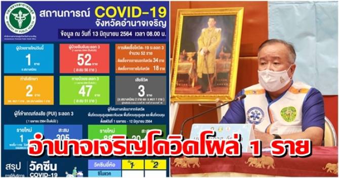 เมื่อเวลา 13.00 น. วันที่ 13 มิ.ย. 64 นายแพทย์ประภาส วีระพล นายแพทย์สาธารณสุขจังหวัดอำนาจเจริญ กล่าวถึง สถานการณ์โควิด – 19 จังหวัดอำนาจเจริญว่า มีผู้ป่วยยืนยันรายใหม่เพิ่ม 1 ราย จาก อ.เสนางคนิคม ชายไทย อายุ 34 ปี เดินทางกลับมาจากกรุงเทพมหานคร ภูมิลำเนา บ้านน้อยดอกหญ้า หมู่ที่ 8 ต.โพนทอง อ.เสนางคนิคม จ.อำนาจเจริญ อาชีพรับจ้าง ทำงานก่อสร้างรถไฟฟ้าสายสีเหลือง พักที่แคมป์คนงาน เขตบางนา กรุงเทพมหานคร รวมมีผู้ป่วยสะสม ระลอก 3 จำนวน 52 ราย เสียชีวิตสะสม 3 ราย คือ อ.เสนางคนิคม 2 ราย และ อ.พนา 1 ราย หายป่วยระลอก 3 แล้ว จำนวน 47 ราย และกำลังรักษาที่โรงพยาบาล 2 ราย ได้แก่ ที่ รพ.เสนางคนิคม 1 ราย ,รพ.พนา 1 ราย