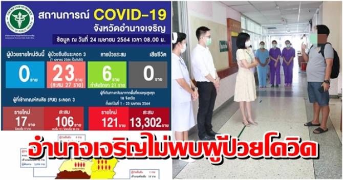 เมื่อเวลา 12.00 น.วันที่ 24 เมษายน พ.ศ.2564 สำนักงานสาธารณสุขจังหวัดอำนาจเจริญ รายงาน สถานการณ์โควิด 19 จังหวัดอำนาจเจริญ ว่า ผู้ป่วยรายใหม่วันนี้ 0 ราย ผู้ป่วยยืนยันระลอก 3 ( 1 เมษายน 2564 เป็นต้นไป) 23 ราย(สะสม 27 ราย) หายป่วยสะสม 6 ราย กำลังรักษา 21 ราย เสียชีวิต 0 ราย ผู้ที่เข้าเกณฑ์สงสัย(PUI) รายใหม่ 17 ราย ไม่พบเชื้อ 17 ราย สะสม 106 ราย พบเชื้อ 12 ราย ไม่พบเชื้อ 94 ราย ผู้ที่เดินทางกลับมาจาพื้นที่ควบคุมสูงสุด 18 จังหวัด ตั้งแต่วันที่ 1 – 23 เมษายน 2564 รายใหม่ 121 ราย สะสม 13,302 ราย