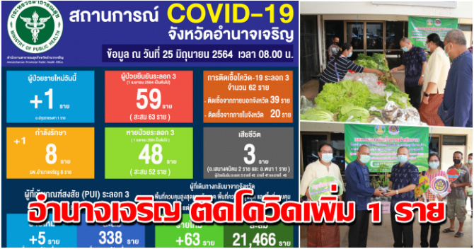 โดยมีรายละเอียด ดังนี้ ผู้ป่วยรายใหม่วันนี้ 1 ราย อ.ปทุมราชวงศา 1 ราย ผู้ป่วยยืนยันระลอก 3 ( 1เมษายน 2564 เป็นต้นไป) 59 ราย(สะสม 63 ราย) กำลังรักษา 8 ราย รพ.อำนาจเจริญ 8 ราย หายป่วยระลอก 3 ( 1 เมษายน 2564 เป็นต้นไป) 48 ราย(สะสม 52 ราย) เสียชีวิต 3 ราย อ.เสนางคนิคม 2 ราย และ อ.พนา 1 ราย ผู้ป่วยยืนยัน ระลอก 3 รายที่ 45 รายที่ 47 และรายที่ 40 ผู้ที่เข้าเกณฑ์สงสัย (PUI) ระลอก 3 ( 1 เมษายน 2564 เป็นต้นไป) รายใหม่ 5 ราย พบเชื้อ 0 ราย ไม่พบเชื้อ 5 ราย รอผลตรวจ 0 ราย สะสม 338 ราย พบเชื้อ 29 ราย ไม่พบเชื้อ 309 ราย รอผลตรวจ 0 ราย ผู้ที่เดินทางกลับมาจากจังหวัดควบคุมสูงสุดและเข้มงวด พื้นที่ควบคุมสูงสุดและพื้นที่ควบคุม ตั้งแต่วันที่ 1 เมษายน – 24 มิถุนายน 2564 รายใหม่ 63 ราย สะสม 21,466 ราย