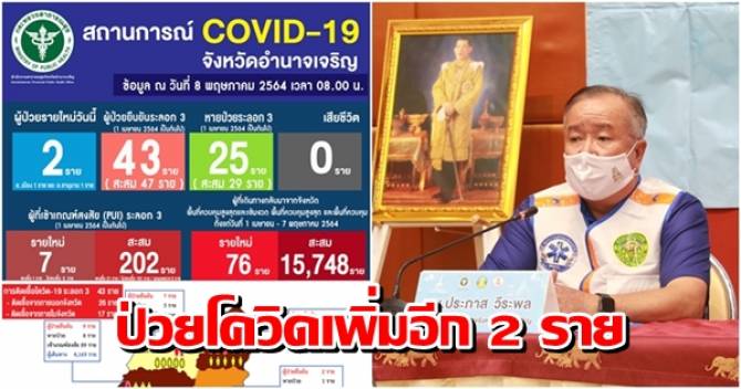 ด้าน นายแพทย์ประภาส วีระพล นายแพทย์สาธารณสุขจังหวัดอำนาจเจริญ กล่าวว่า สถานการณ์โควิด 19 จังหวัดอำนาจเจริญ วันนี้( 8 พ.ค.64) มีผู้ป่วยยืนยันรายใหม่เพิ่ม 2 ราย คือรายที่ 42 จากอำเภอชานุมาน 1 ราย เป็นเพศหญิง อายุ 11 ปี เชื่อมโยงกับครอบครัว เป็นผู้สัมผัสเสี่ยงสูงติดเชื้อยืนยันระลอก 3 รายที่ 33 จังหวัดอำนาจเจริญ พักอยู่บ้านเดียวกัน ส่วนรายที่ 43 จาก อ.เมืองอำนาจเจริญ เพศหญิง อายุ 29 ปี เดินทางกลับจาก กทม. รวมผู้ป่วยยืนยันสะสม ระลอก 3 จำนวน 43 ราย และหายป่วยกลับบ้านได้เพิ่มอีก 2 ราย คือ อ.เมืองอำนาจเจริญ 1 ราย,อ.เสนางคนิคม 1 ราย รวมหายป่วยระลอก 3 จำนวน 25 ราย และกำลังรักษาที่โรงพยาบาล 18 ราย…
