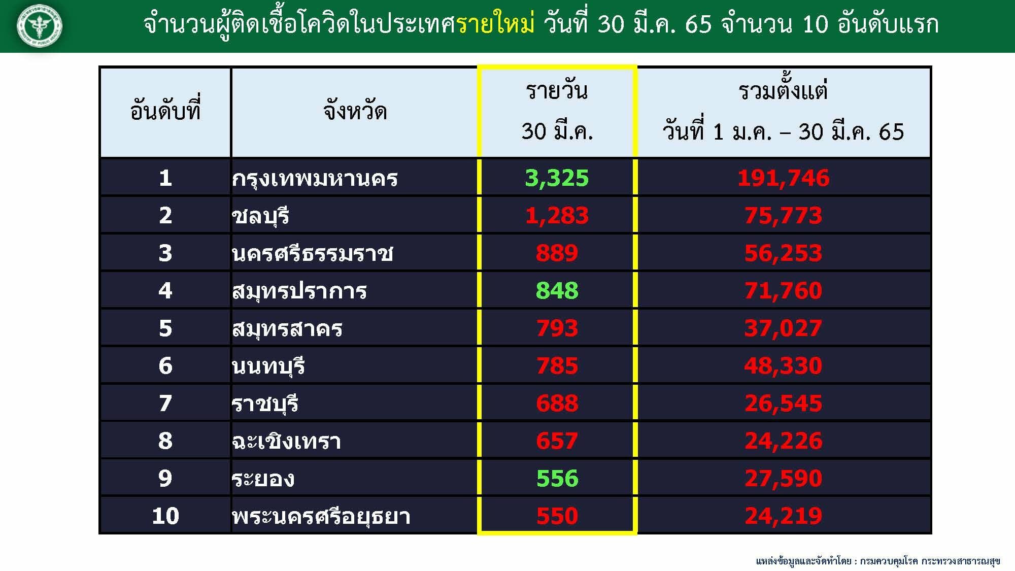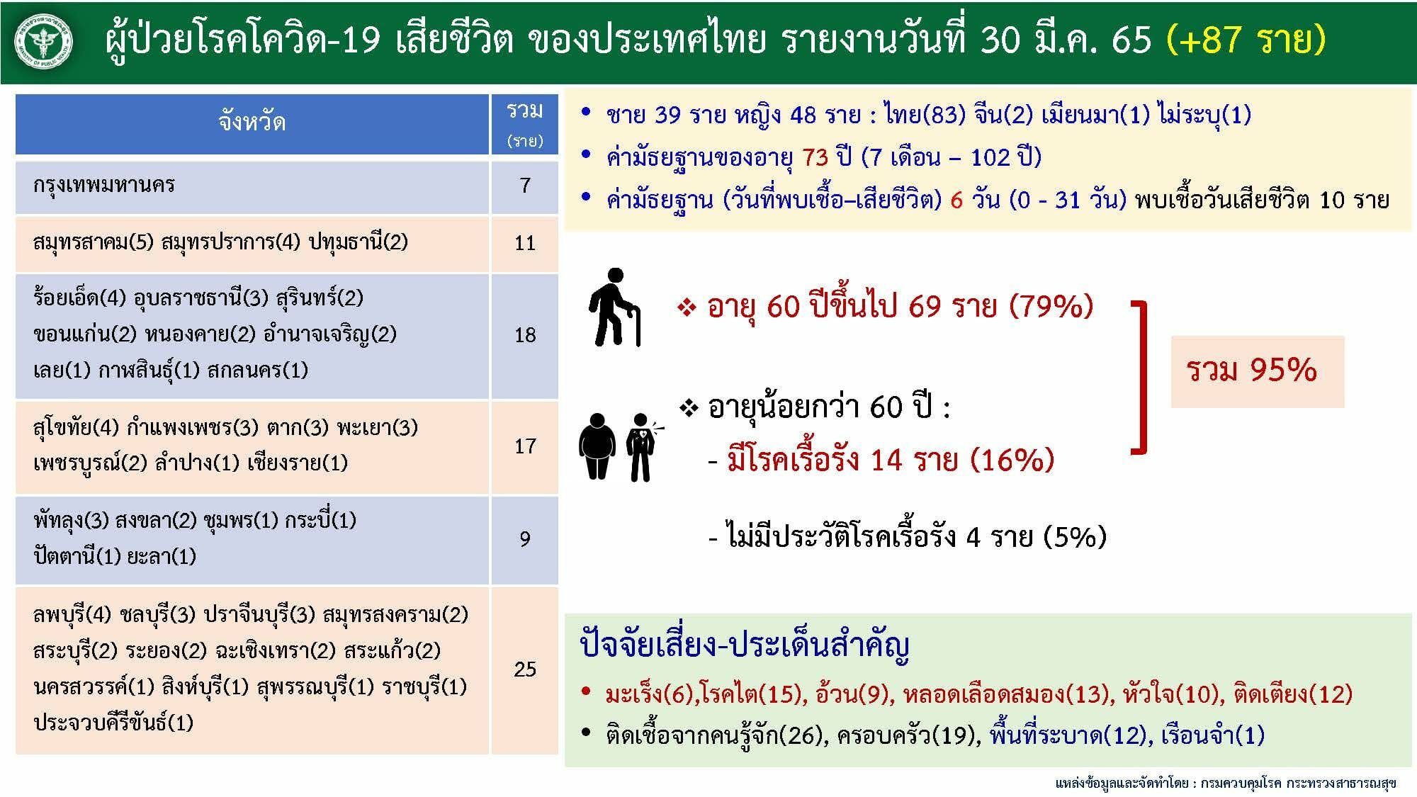 วันที่ 30 มี.ค.65 ศูนย์บริหารสถานการณ์โควิด 19 (ศบค.) รายงานสถานการณ์โควิด 19 ประจำวันว่า ประเทศไทยยังพบผู้ติดเชื้อใหม่เกินหมื่นรายเป็นวันที่ 54 ในการระบาดระลอกโอมิครอน โดยวันนี้พบติดเชื้อรายใหม่ 25,389 ราย สะสม 3,600,787 ราย หายป่วย 26,084 ราย สะสม 3,331,370 ราย เสียชีวิต 87 ราย สะสม 25,045 ราย