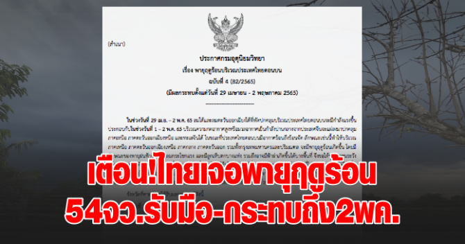 ในช่วงวันที่ 29 เม.ย. – 2 พ.ค. 65 ลมใต้และลมตะวันออกเฉียงใต้ที่พัดปกคลุมบริเวณประเทศไทยตอนบนจะมีกำลังแรงขึ้น ประกอบกับในช่วงวันที่ 1 – 2 พ.ค. 65 บริเวณความกดอากาศสูงหรือมวลอากาศเย็นกำลังปานกลางจากประเทศจีนจะแผ่ลงมาปกคลุมภาคเหนือ ภาคตะวันออกเฉียงหนือ และทะเลจีนใต้ ในขณะที่ประเทศไทยตอนบนมีอากาศร้อนถึงร้อนจัด ลักษณะเช่นนี้ทำให้บริเวณภาคเหนือ ภาคตะวันออกเฉียงเหนือ ภาคกลาง ภาคตะวันออก รวมทั้งกรุงเทพมหานครและปริมณฑล จะมีพายุฤดูร้อนเกิดขึ้น โดยมีลักษณะของพายุฝนฟ้าคะนอง ลมกระโชกแรง และมีลูกเห็บตกบางแห่ง รวมถึงอาจมีฟ้าผ่าเกิดขึ้นได้บางพื้นที่ จึงขอให้ประชาชนระวังอันตรายจากภัยดังกล่าว โดยหลีกเลี่ยงการอยู่ในที่โล่งแจ้ง ใต้ต้นไม้ใหญ่ ใกล้สิ่งปลูกสร้างและป้ายโฆษณาที่ไม่แข็งแรง และขอให้เพิ่มความระมัดระวังในการสัญจรผ่านบริเวณที่มีพายุฝนฟ้าคะนองซึ่งอาจเกิดอันตรายจากลมกระโชกแรงและฟ้าผ่าได้ สำหรับเกษตรกรควรเตรียมการป้องกันและระวังความเสียหายที่จะเกิดต่อผลผลิตทางการเกษตรไว้ด้วย จังหวัดที่คาดว่าจะได้รับผลกระทบ มีดังนี้