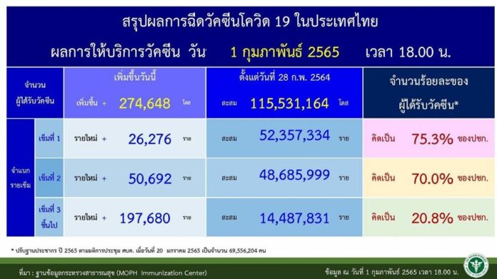 การฉีดวัคซีนโควิด 19 วันที่ 1 ก.พ. ฉีดได้ 274,648 โดส สะสมรวม 115,531,164 โดส เป็นเข็มแรก 52,357,334 ราย คิดเป็น 75.3% ของประชากร เข็มสอง 48,685,999 ราย คิดเป็น 70% ของประชากร และเข็มสาม 14,487,831 ราย คิดเป็น 20.8% ของประชากร