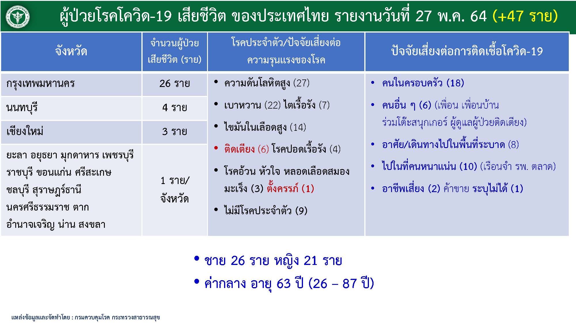 ศบค. เผยรายละเอียดผู้เสียชีวิตจากโควิด-19 รายใหม่ วันนี้ (27 พ.ค.) พุ่งอีก 47 ราย ยอดเสียชีวิตสะสม 920 ราย