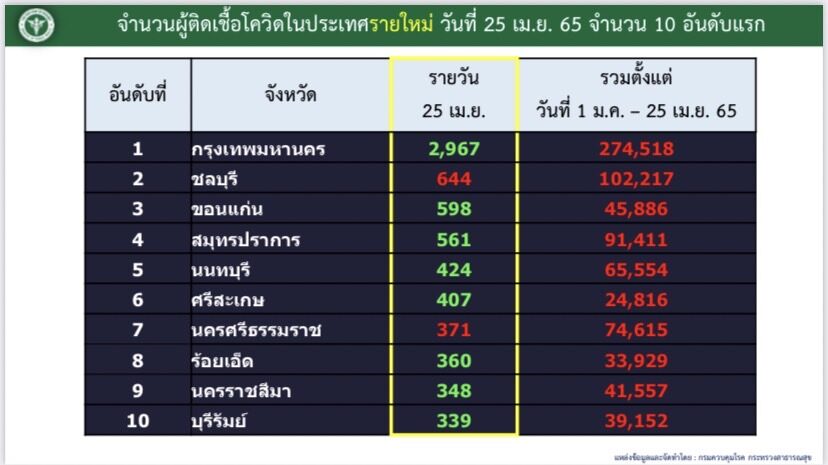 จำนวนผู้ติดเชื้อรายใหม่ 10 อันดับแรก คือ 1.กรุงเทพมหานคร 2,967 ราย 2.ชลบุรี 644 ราย 3.ขอนแก่น 598 ราย 4.สมุทรปราการ 561 ราย 5.นนทบุรี 424 ราย 6.ศรีสะเกษ 407 ราย 7.นครศรีธรรมราช 371 ราย 8.ร้อยเอ็ด 360 ราย 9.นครราชสีมา 348 ราย และ 10.บุรีรัมย์ 339 ราย