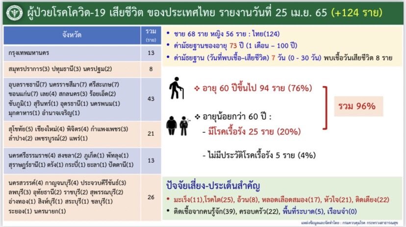 รายงานศบค. ระบุต่อว่า ผู้เสียชีวิตจำนวน 124 ราย อยู่ในกรุงเทพมหานคร 13 ราย สมุทรปราการ 3 ราย ปทุมธานี 3 ราย นครปฐม 2 ราย อุบลราชธานี 7 ราย นครราชสีมา 7 ราย ศรีสะเกษ 7 ราย ขอนแก่น 7 ราย เลย 4 ราย สกลนคร 3 ราย ร้อยเอ็ด 2 ราย ชัยภูมิ 1 ราย สุรินทร์ 1 ราย อุดรธานี 1 ราย นครพนม 1 ราย มุกดาหาร 1 ราย อำนาจเจริญ 1 ราย สุโขทัย 5 ราย เชียงใหม่ 4 ราย พิจิตร 4 ราย กำแพงเพชร 3 ราย