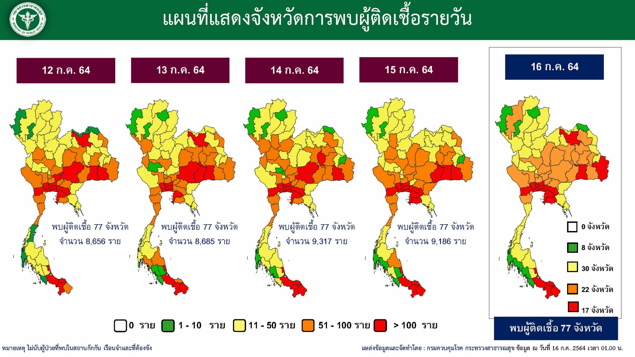 ทั้งนี้ การติดเชื้อใหม่ 9,692 ราย เป็นการติดเชื้อในประเทศ 9,062 ราย สัดส่วนมาจาก กทม.และปริมณฑลสูงสุด 4,356 ราย 4 จังหวัดชายแดนใต้ 773 ราย และจังหวัดอื่นๆ (67 จังหวัด) 3,933 ราย, ติดเชื้อจากเรือนจำ 615 ราย ติดเชื้อจากต่างประเทศ 15 ราย มาจากอินเดีย คูเวต สิงคโปร์ สหรัฐอาหรับเอมิเรตส์ ประเทศละ 1 ราย, กัมพูชา 5 ราย และพม่า 6 ราย เข้ามาช่องทางธรรมชาติ 5 ราย