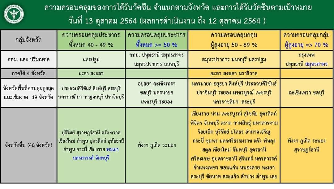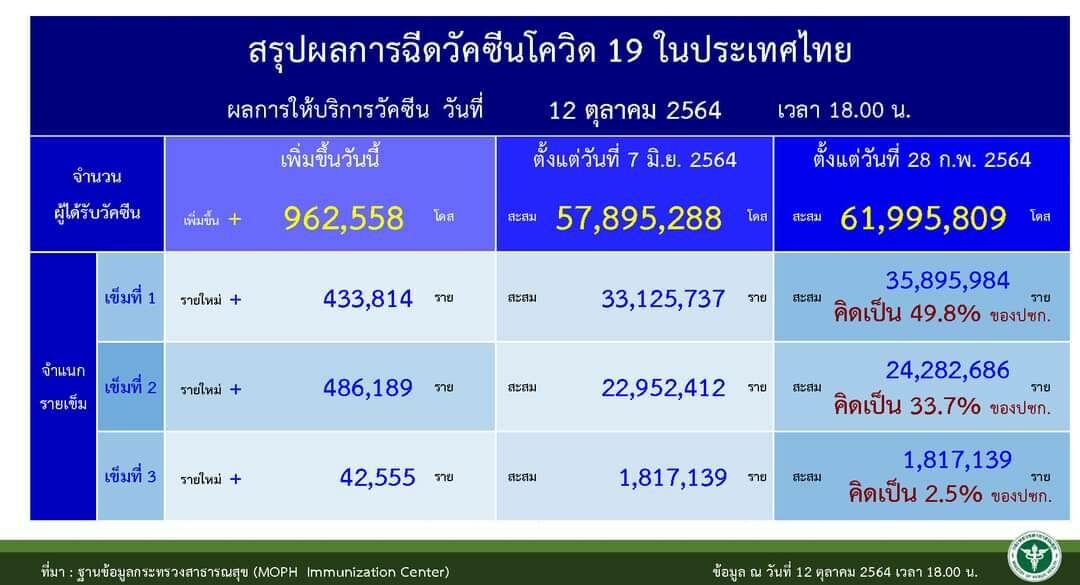 เมื่อวันที่ 13 ตุลาคม ศูนย์บริหารสถานการณ์การแพร่ระบาดของโรคติดเชื้อไวรัสโคโรนา 2019 (โควิด-19) หรือ ศบค. รายงานภาพรวมการได้รับการฉีดวัคซีนในพื้นที่ 77 จังหวัด มียอดการฉีดวัคซีนสะสมตั้งแต่วันที่ 28 กุมภาพันธ์-12 ตุลาคม 2564 อยู่ที่ 61,995,809 โดส แยกเป็น เข็มที่ 1 จำนวน 35,895,984 ราย คิดเป็น 49.8% ของประชากร เข็มที่ 2 จำนวน 24,282,626 ราย คิดเป็น 33.7% ของประชากร เข็มที่ 3 จำนวน 1,817,139 ราย คิดเป็น 2.5% ของประชากร